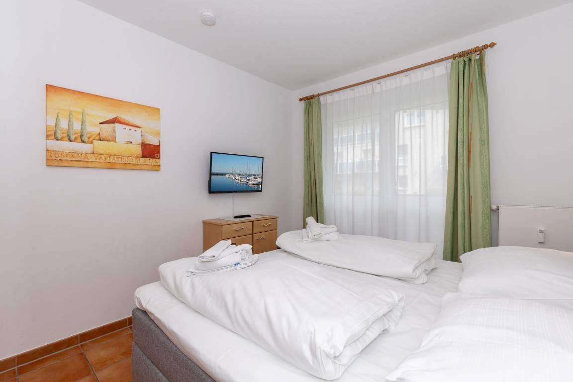 Das Schlafzimmer ist mit einem hochwertigen Boxspringbett, einem geräumigen Kleiderschrank, Verdunklungsvorhängen und einem Zweitfernseher (32 Zoll) ausgestattet und besitzt ebenfalls einen direkten Zugang zur Terrasse.