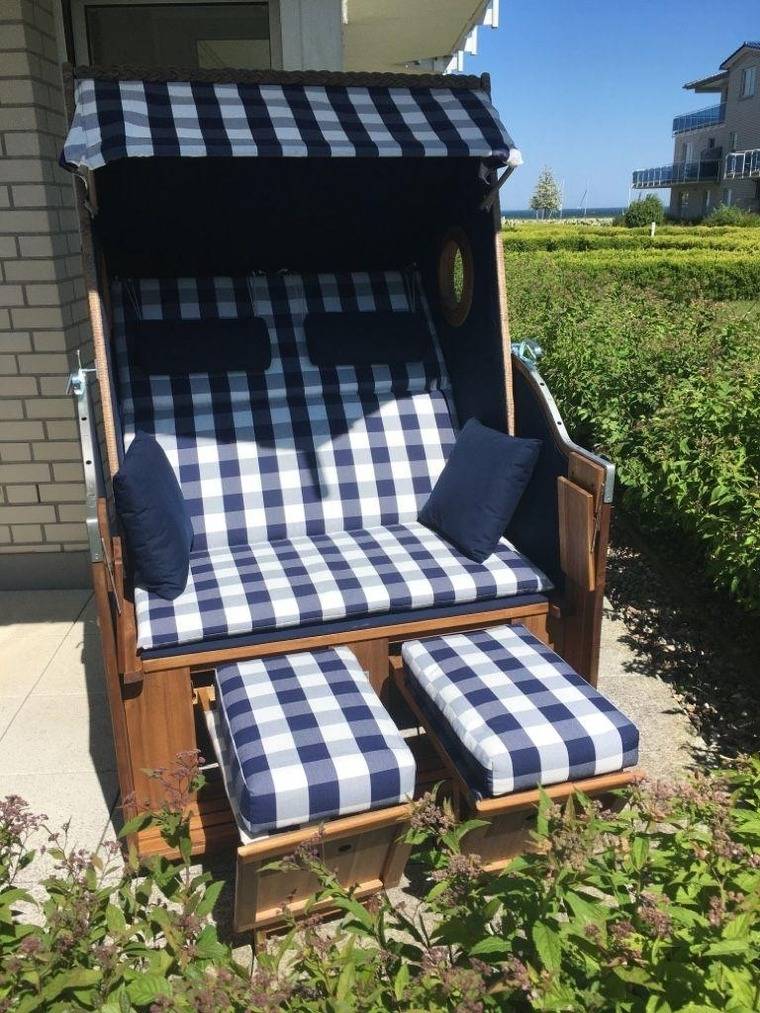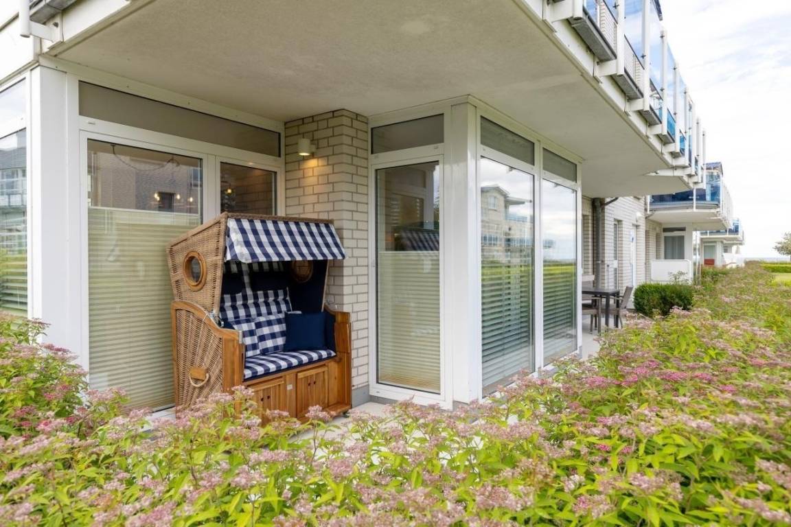 Die Terrasse in Süd-Ost Lage verfügt über einen hübschen, maritim anmutenden Strandkorb und in der Hauptsaison über Terrassenmöbel.