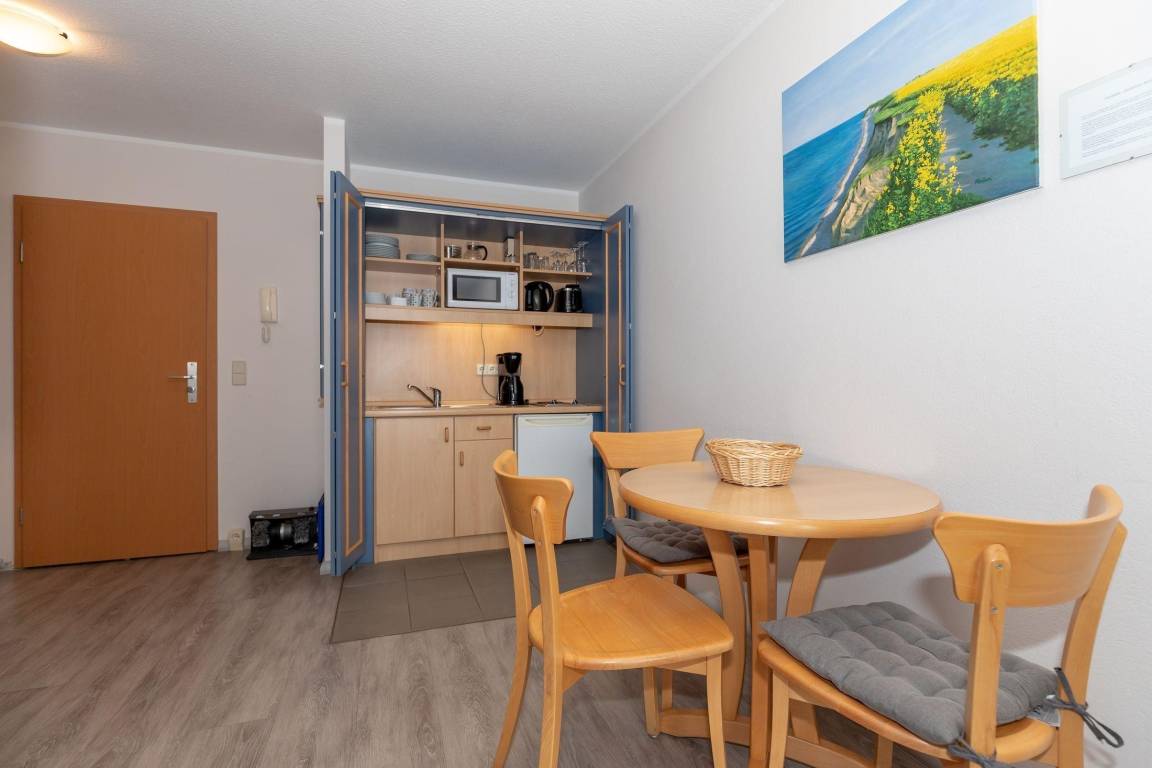 An den Wohnbereich grenzt die kleine Küchenzeile und der Esstisch. Die Küche ist voll ausgestattet, hier müssen Sie auf nichts verzichten, schnell können Sie hier Ihre Lieblingsmahlzeit zaubern.