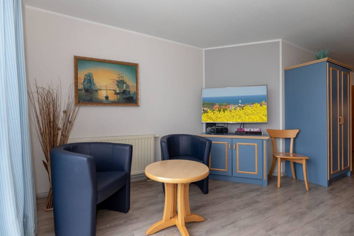 Wohnzimmer und Schlafzimmer sind mit maritimen Ölgemälden ausgestattet, die das Ostsee-Feeling in das Apartment übertragen.