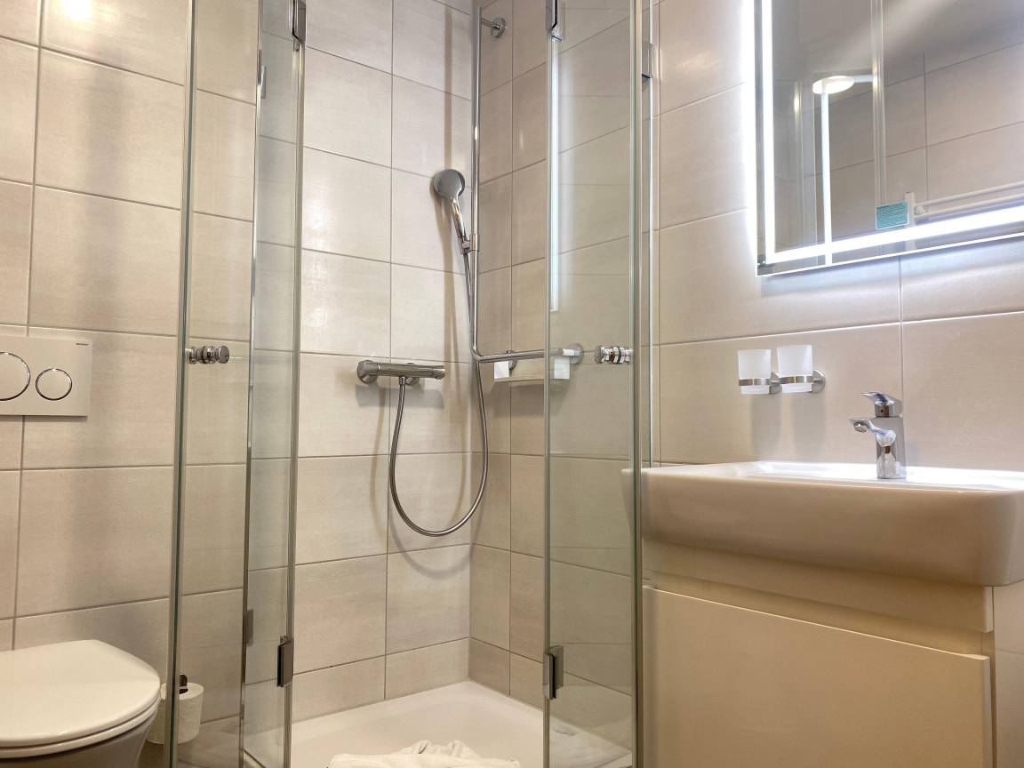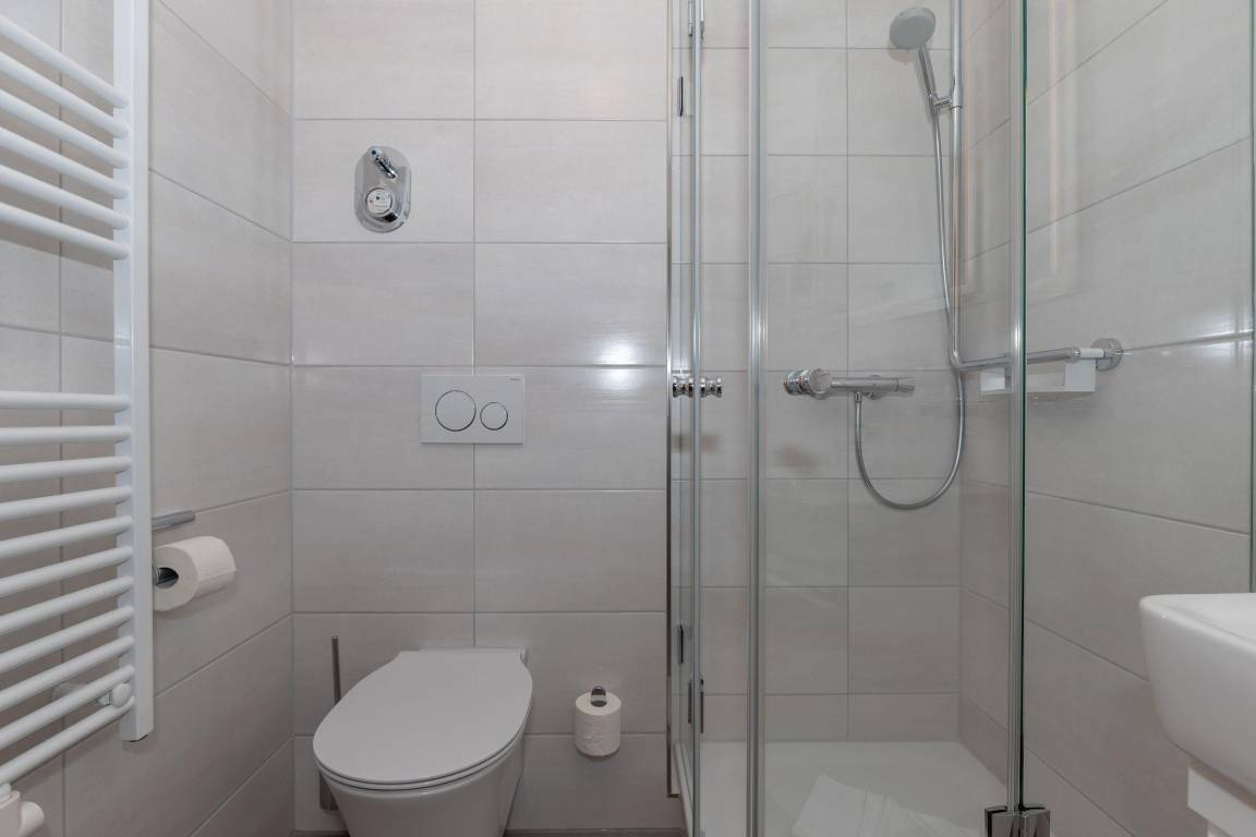 Das Badezimmer ist mit einer Dusche, einem Waschbecken mit Unterschrank, einem Handtuchheizkörper und WC ausgestattet.