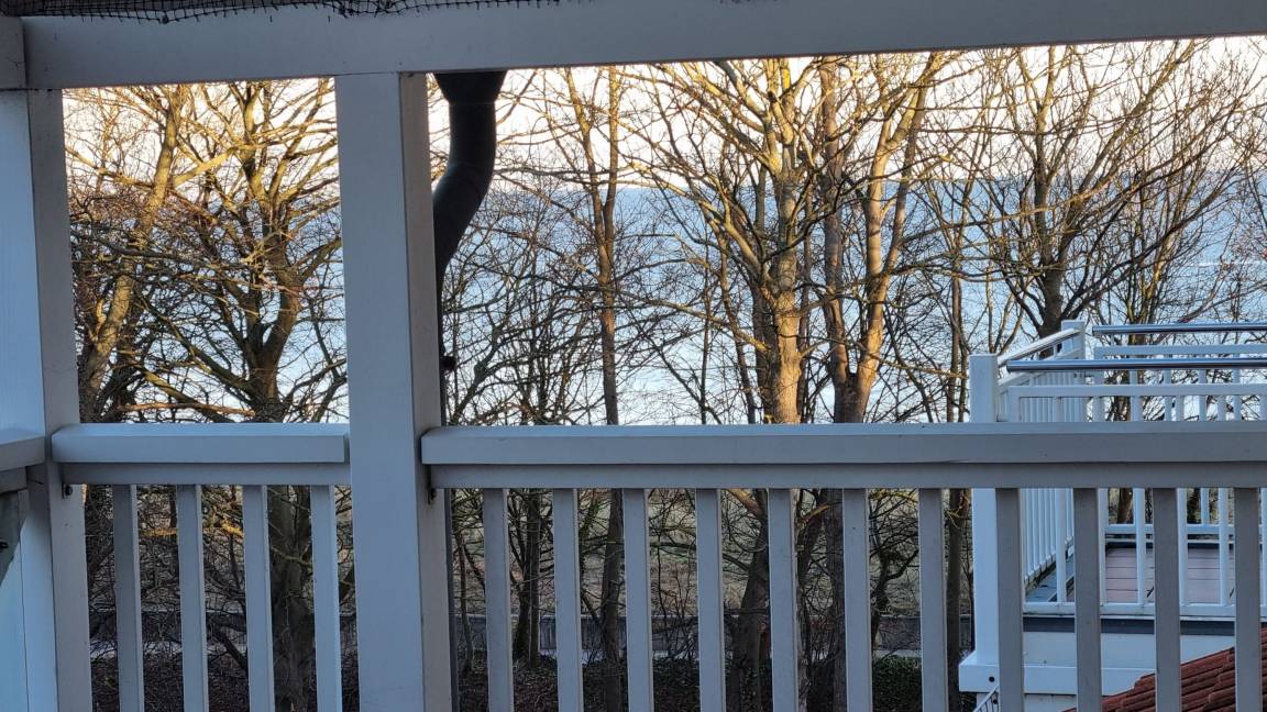 Das Wohnzimmer bietet eine Schlafcouch und führt zum West-Balkon, von dem aus ein Teilseeblick auf die Ostsee möglich ist. Ein Fernseher steht zur Unterhaltung bereit.