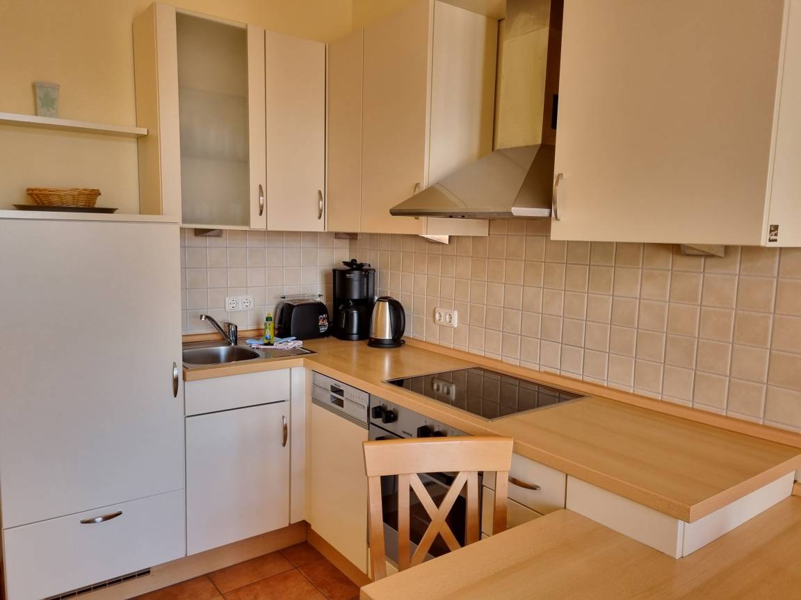 Die offene Küche ist komplett ausgestattet mit Kochfeld, Backofen, Kühlschrank und Geschirrspüler.