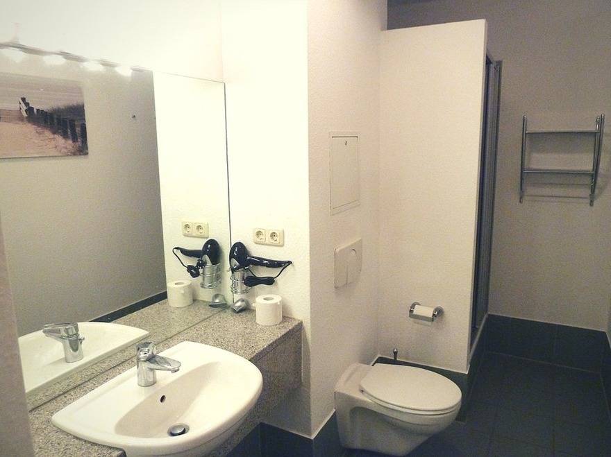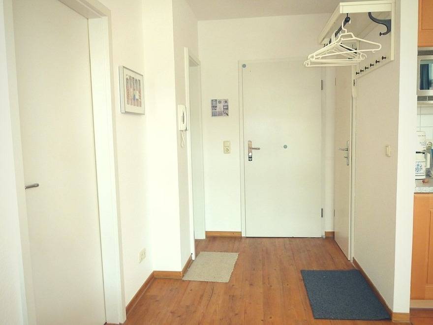 Das geräumige Duschbad bietet ein großes Waschbecken mit viel Ablagefläche, Kosmetikspiegel und Fön. Die Wohnung wird durch einen kleinen Abstellraum, z.B. für Koffer, komplettiert.