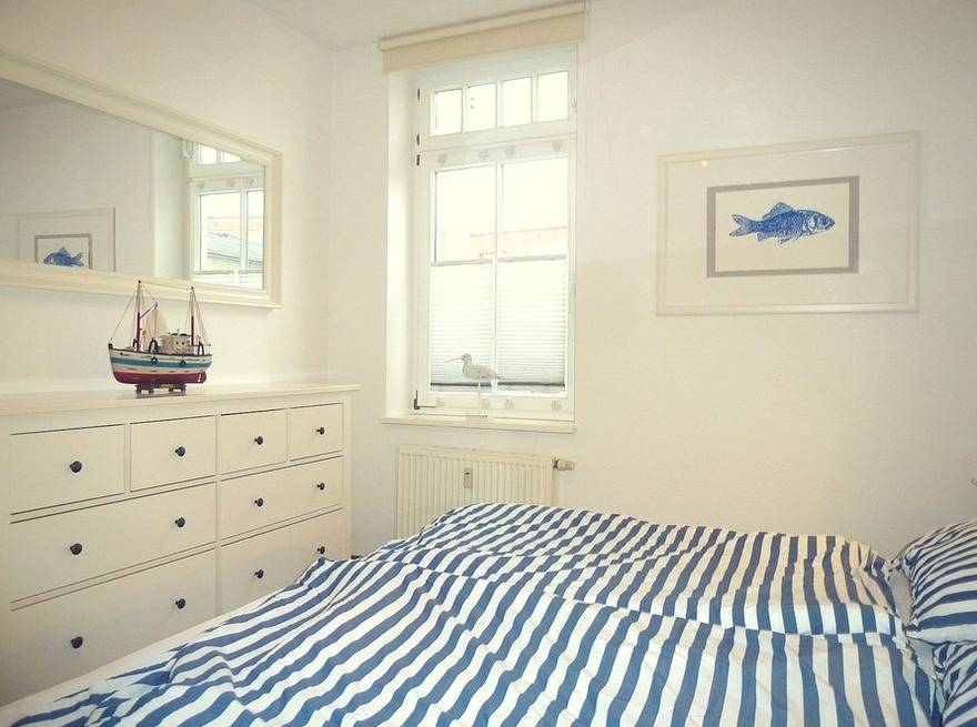 Im hellen, maritim gestalteten Schlafzimmer befindet sich ein komfortables Doppelbett mit zwei Matratzen (90 cm x 200 cm). Ein Kleiderschrank und eine breite Kommode bieten ausreichend Stauraum.