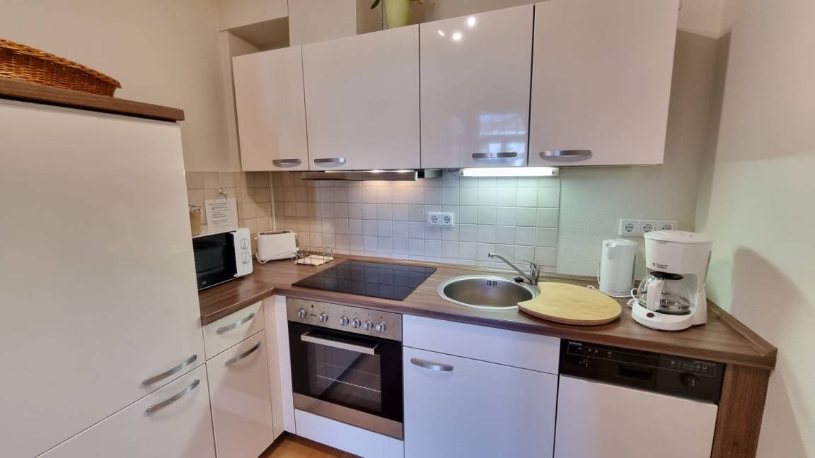 Die Pantryküche verfügt über ein Cerankochfeld, einen Backofen, einer Mikrowelle, einem Geschirrspüler sowie einem Kühlschrank inklusive Gefrierfach.