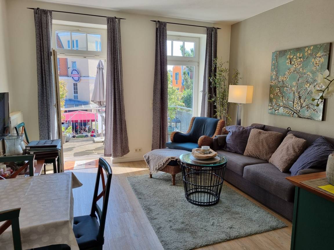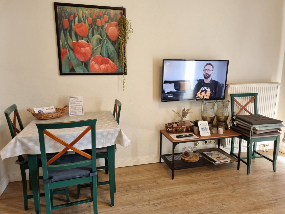 Hell und freundlich eingerichtet bietet die Wohnung einen Wohnbereich mit Sitzgruppe (inkl. Schlafcouch), TV und Hifi-Anlage.