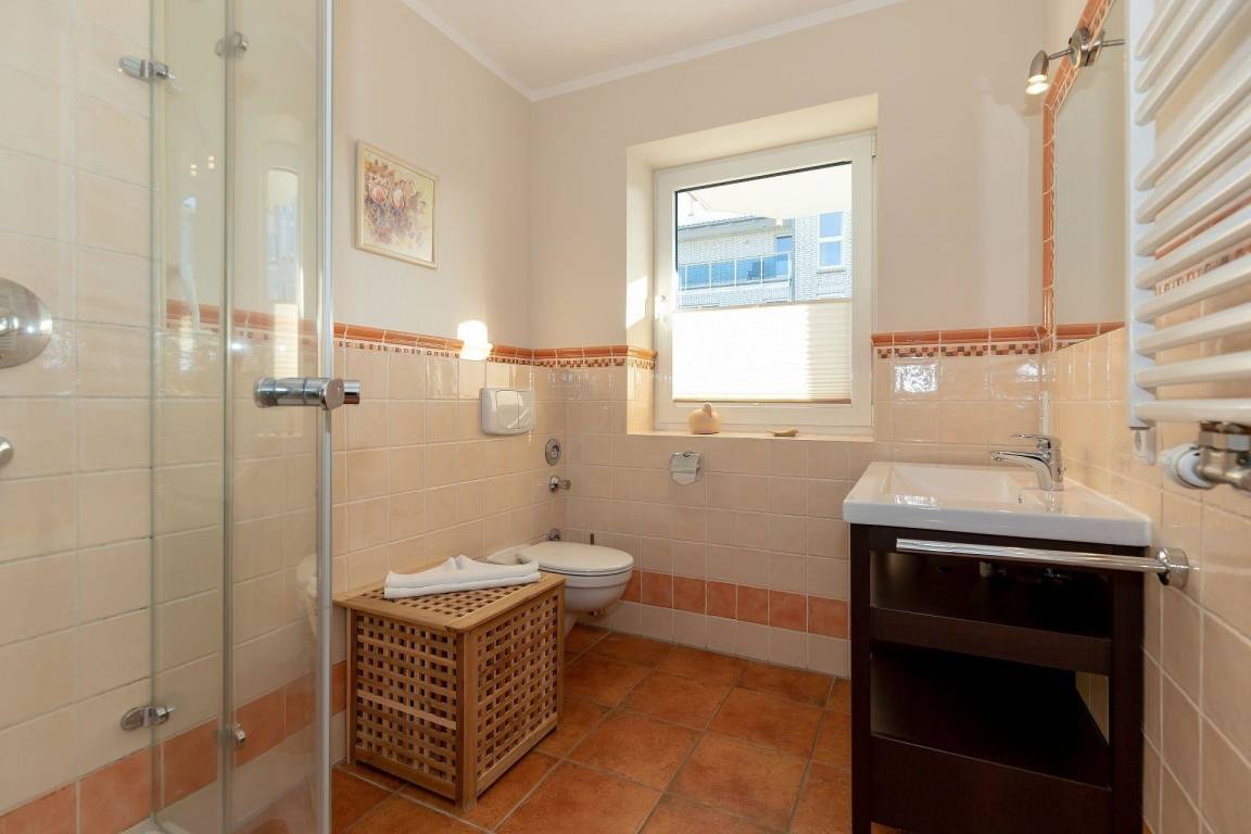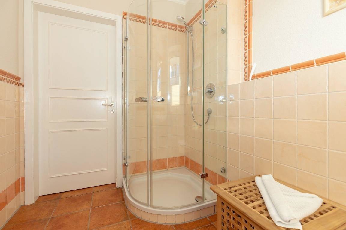 Das Badezimmer besitzt eine schöne Runddusche und einen Waschtisch mit großem Spiegel.