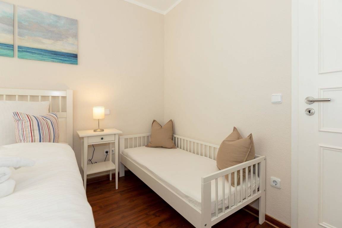 Das Schlafzimmer ist mit einem großen Doppelbett und einem Kinderbett ausgestattet. Auf dem Bett finden Sie einen erholsamen Schlaf. Im Kleiderschrank, der sich auf dem Flur befindet, haben Sie genügend Platz um Ihre Urlaubsgarderobe unterzubringen.