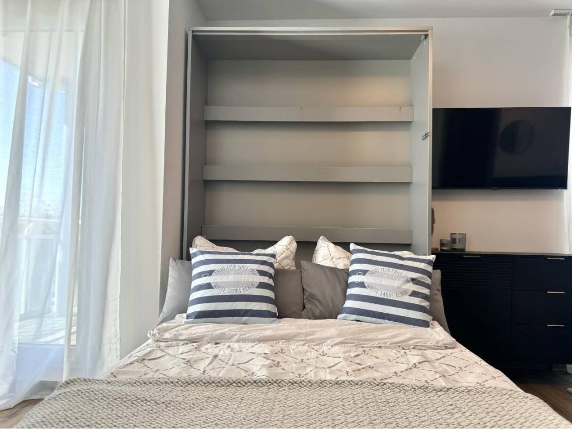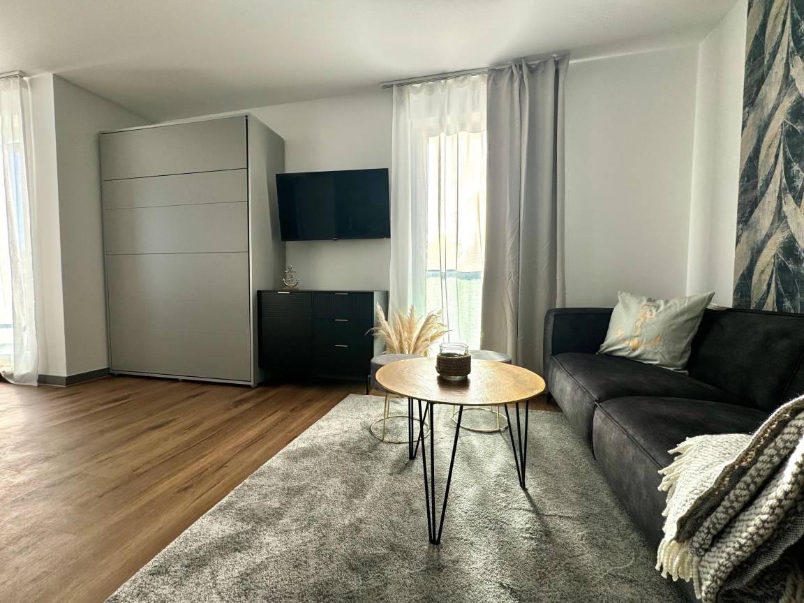Der komfortable Wohnbereich ist mit einer Sofa- und Sesselecke ausgestattet. Ein Schrankbett (1,40m Breite) bietet eine Schlafgelegenheit für eine weitere erwachsene Person. (oder auch 2 Kinder) In diesem Bereich können Sie es sich nach einem ereignisreichen Urlaubstag gemütlich machen und bei einem leckeren Getränk relaxen. Für Ihre Unterhaltung sorgt ein Flachbildschirm-TV.