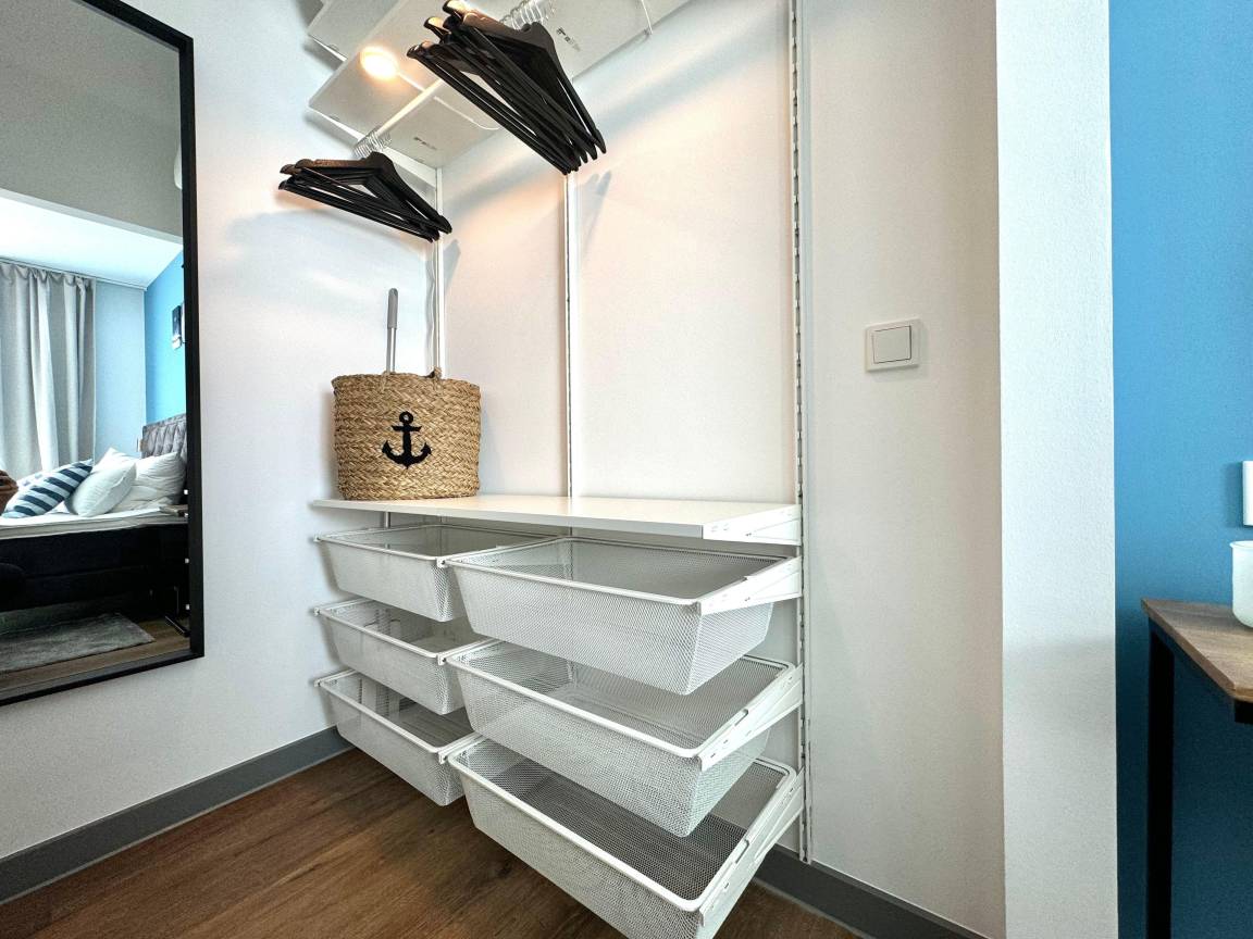 Das separate Schlafzimmer ist mit einem bequemen Doppelbett eingerichtet. Nach einem erholsamen Schlaf sind Sie gerüstet für einen weiteren erlebnisreichen Urlaubstag. Ihre Urlaubsgarderobe findet ausreichend Platz in dem vorhandenen Kleiderschrank. Ein weiteres Fernsehgerät rundet in diesem Bereich die Gemütlichkeit ab.