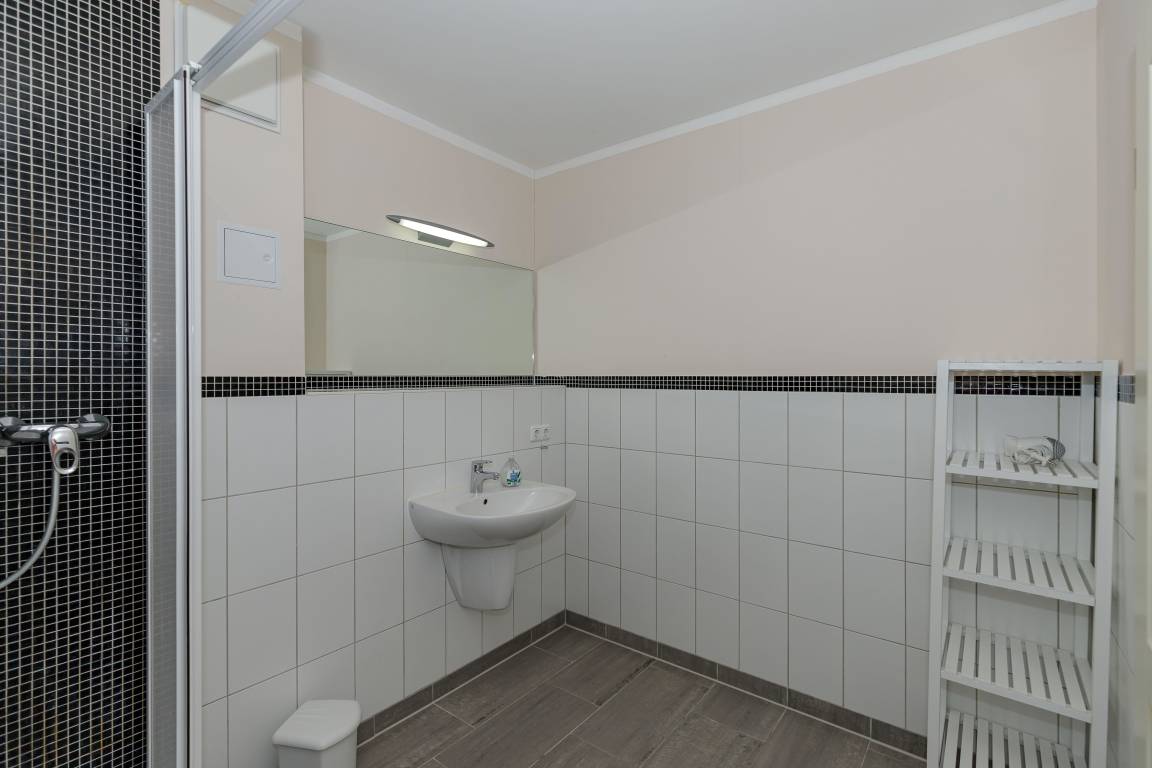 Die Wohnung verfügt über ein Badezimmer mit Dusche. Damit sich niemand in die Quere kommt, ist ein separates WC mit Waschbecken vorhanden.