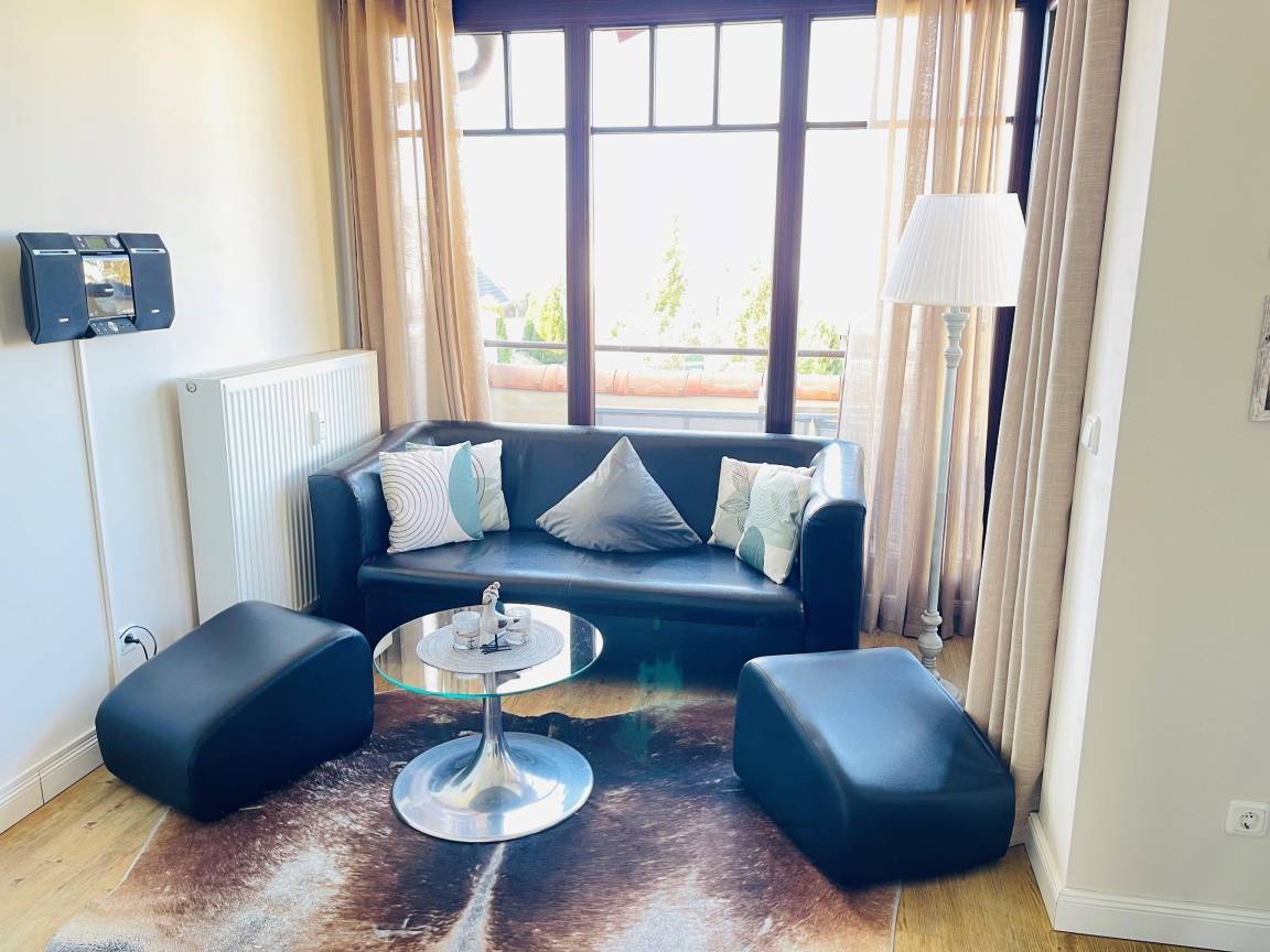 Der lichtdurchflutete Wohnbereich mit seinen bodentiefen Fenstern schafft eine besonders angenehme Atmosphäre und lädt zum Entspannen ein. Machen Sie es sich auf dem gemütlichen Sofa bequem und genießen Sie Ihre Lieblingssendungen auf dem Flachbildfernseher oder lassen Sie den Tag bei Musik über das Radio mit CD-Player ausklingen.