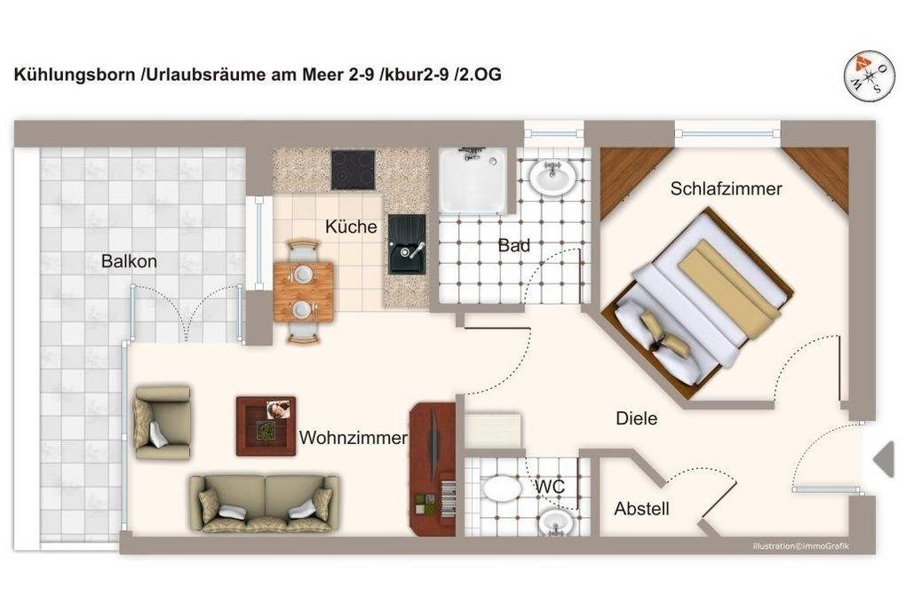 Wellnessliebhaber kommen ebenfalls voll auf ihre Kosten: Die Sauna- und Wellnesswelt KÜBOMARE befindet sich nur etwa 100 Meter entfernt. Alternativ steht Ihnen die hauseigene Sauna in der gepflegten Anlage zur Verfügung – perfekt für entspannte Momente zu jeder Jahreszeit.