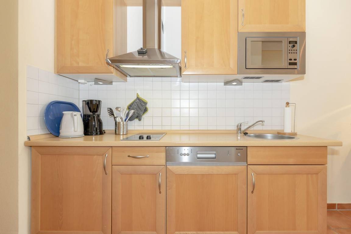 Im angrenzenden Küchenbereich finden Sie einen Kühlschrank, 2-Kochplatten-Herd, Geschirrspülmaschine, Mikrowellengerät, Kaffeemaschine, Wasserkocher und vieles mehr.