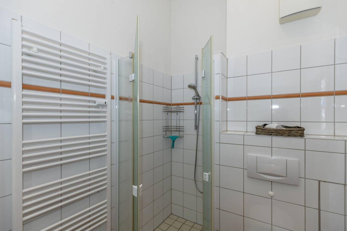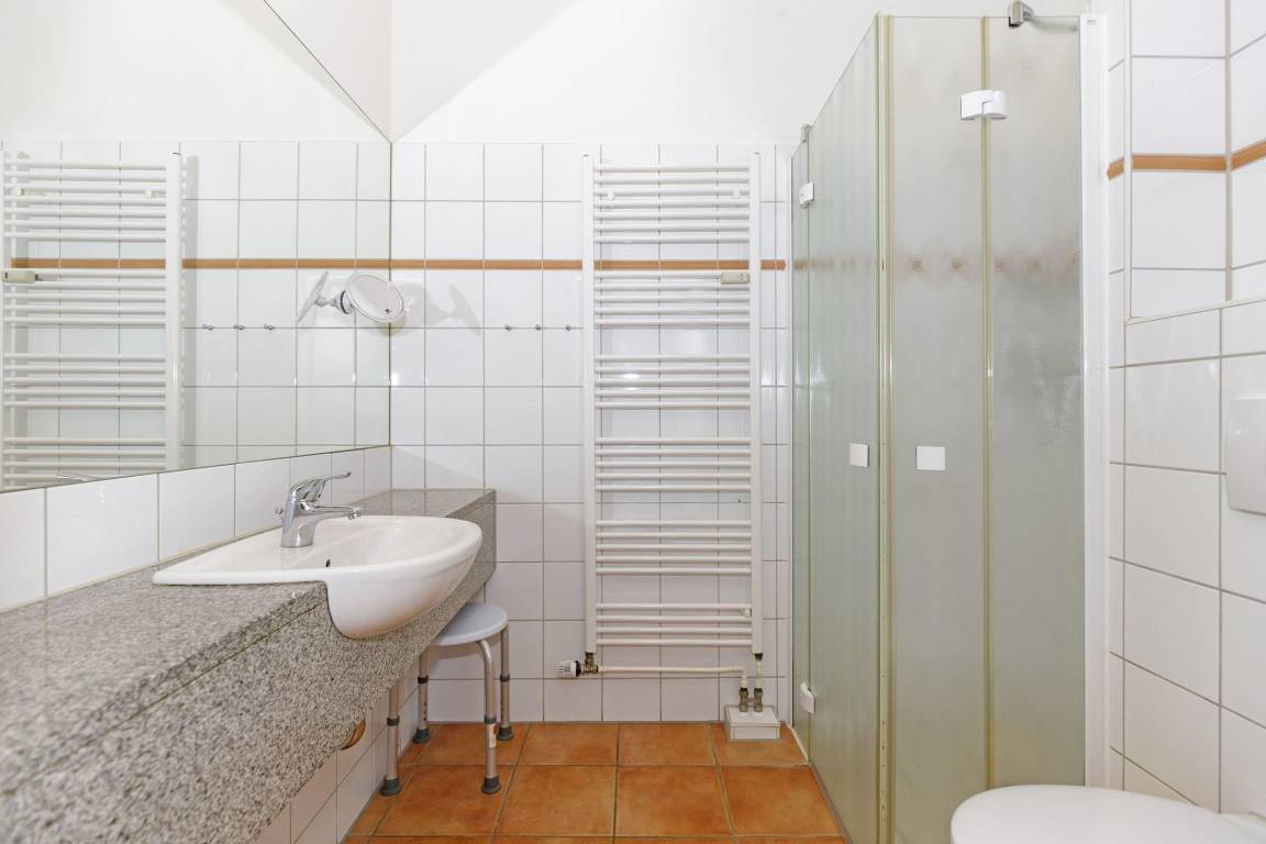 Das Badezimmer ist ausgestattet mit einer Dusche, einem WC, einem Handtuchheizkörper sowie einem ausladenden Waschtisch.