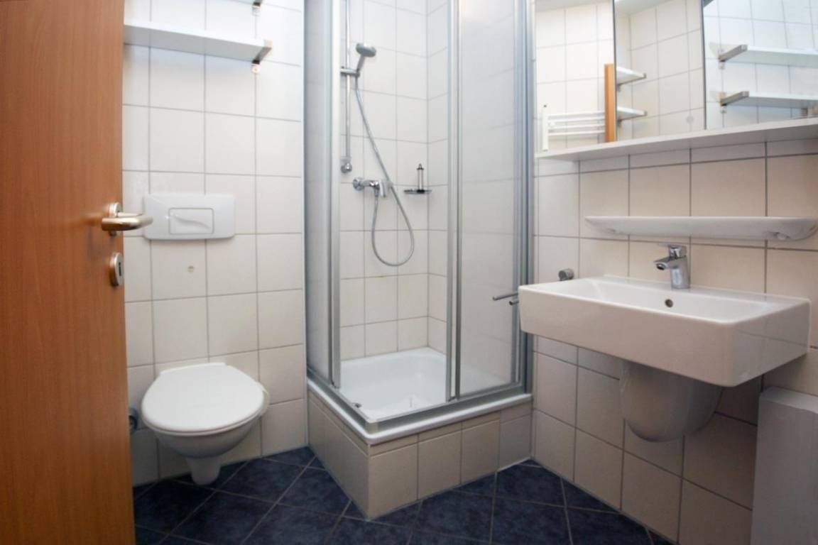 Das Badezimmer ist mit einer Dusche, Waschbecken und WC ausgestattet.