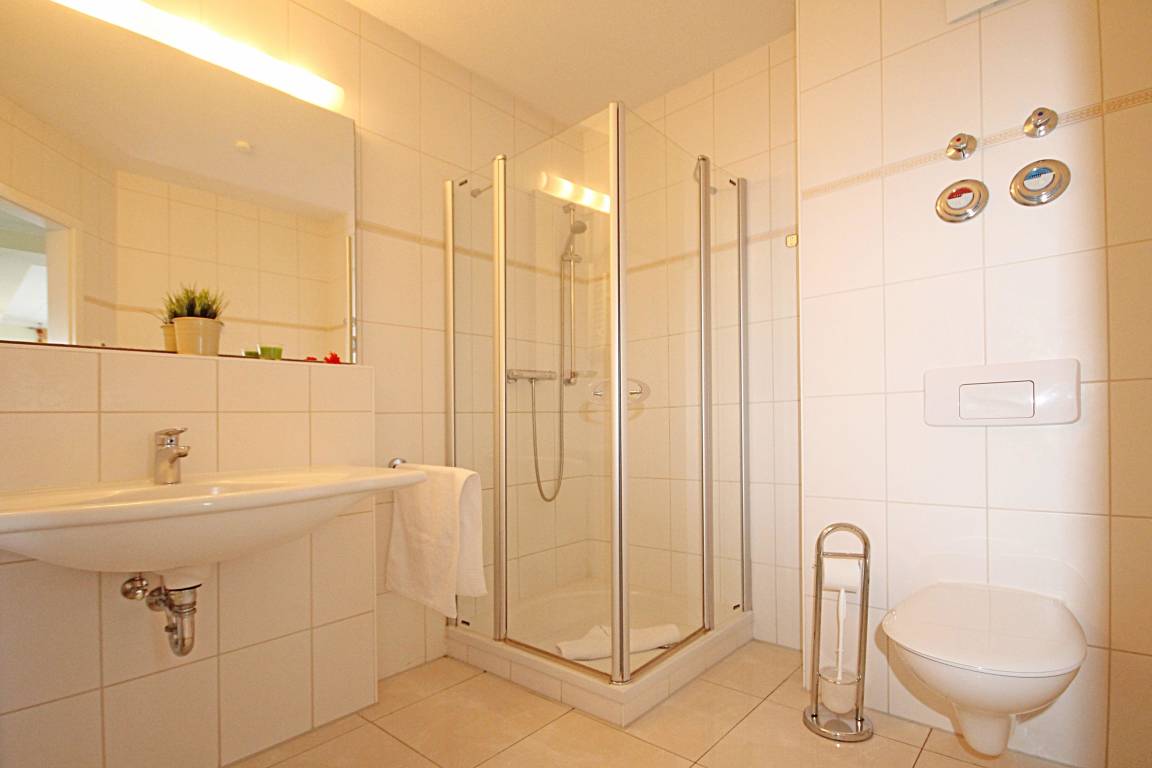 Das Badezimmer ist mit einer Dusche, einem WC und einem Waschtisch und großem Spiegel ausgestattet.