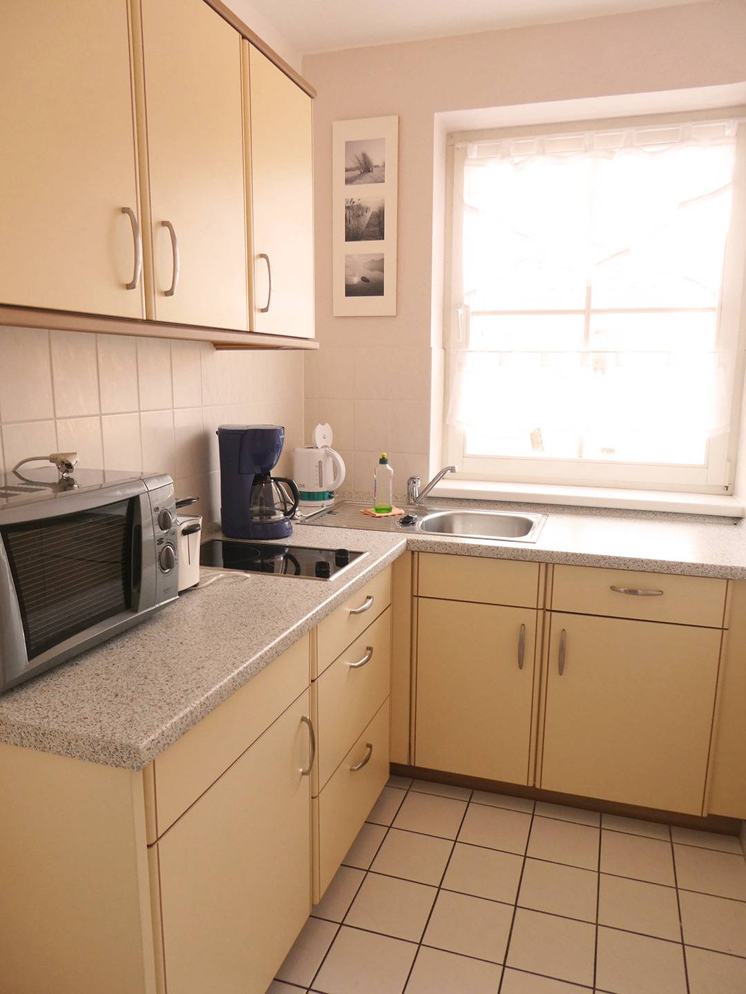 Die separate Küche ist gut ausgestattet mit Kühlschrank, Spüle, 2- Platten-Cerankochfeld, Mikrowelle, Toaster und Kaffeemaschine.