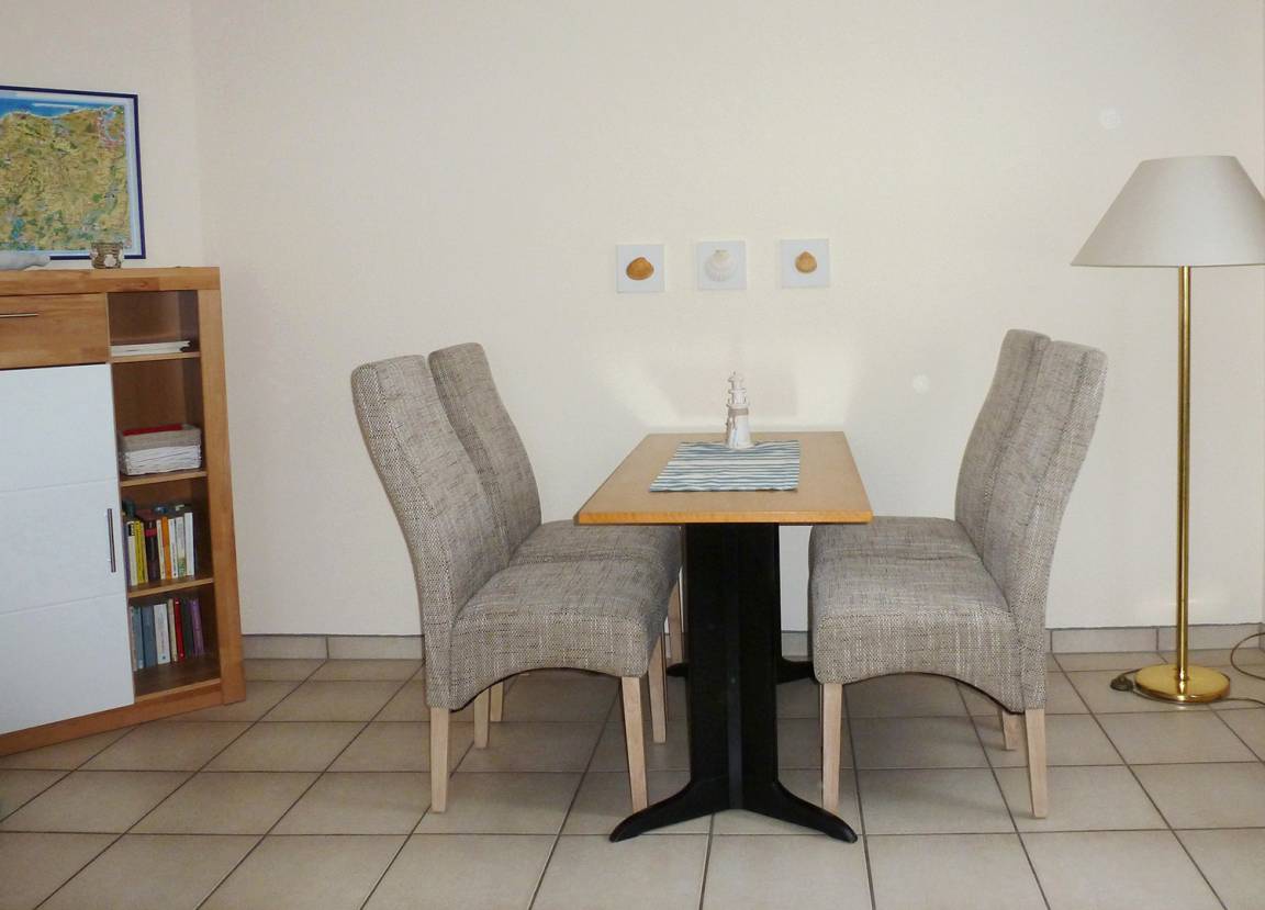 Neben dem geräumigen Wohn- und Esszimmer mit klappbarer Schlafcouch, gibt es ein Schlafzimmer mit Doppelbett, ein saniertes Bad mit Dusche und einen Abstellraum mit Garderobe.