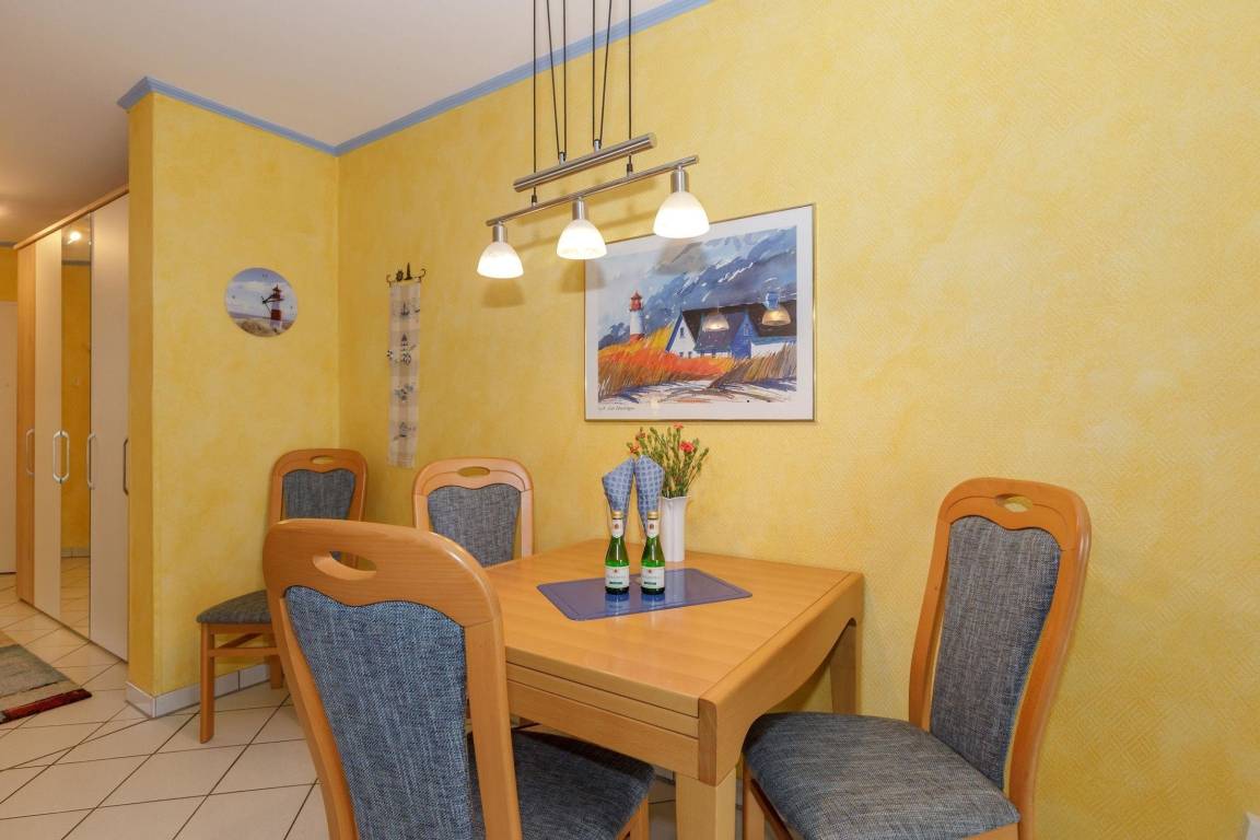 Die Essecke bietet 4 bequeme Stühle und einen ausziehbaren Tisch, somit steht einer ausgedehntem gemeinsamen Mahlzeit oder einem gemütlichen Spielabend nichts im Wege.