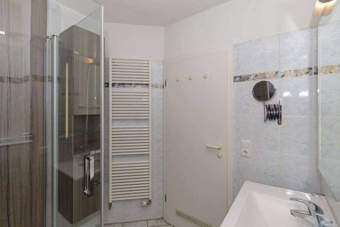 Das renovierte Duschbad verfügt über Handtuchwärmer und Föhn .