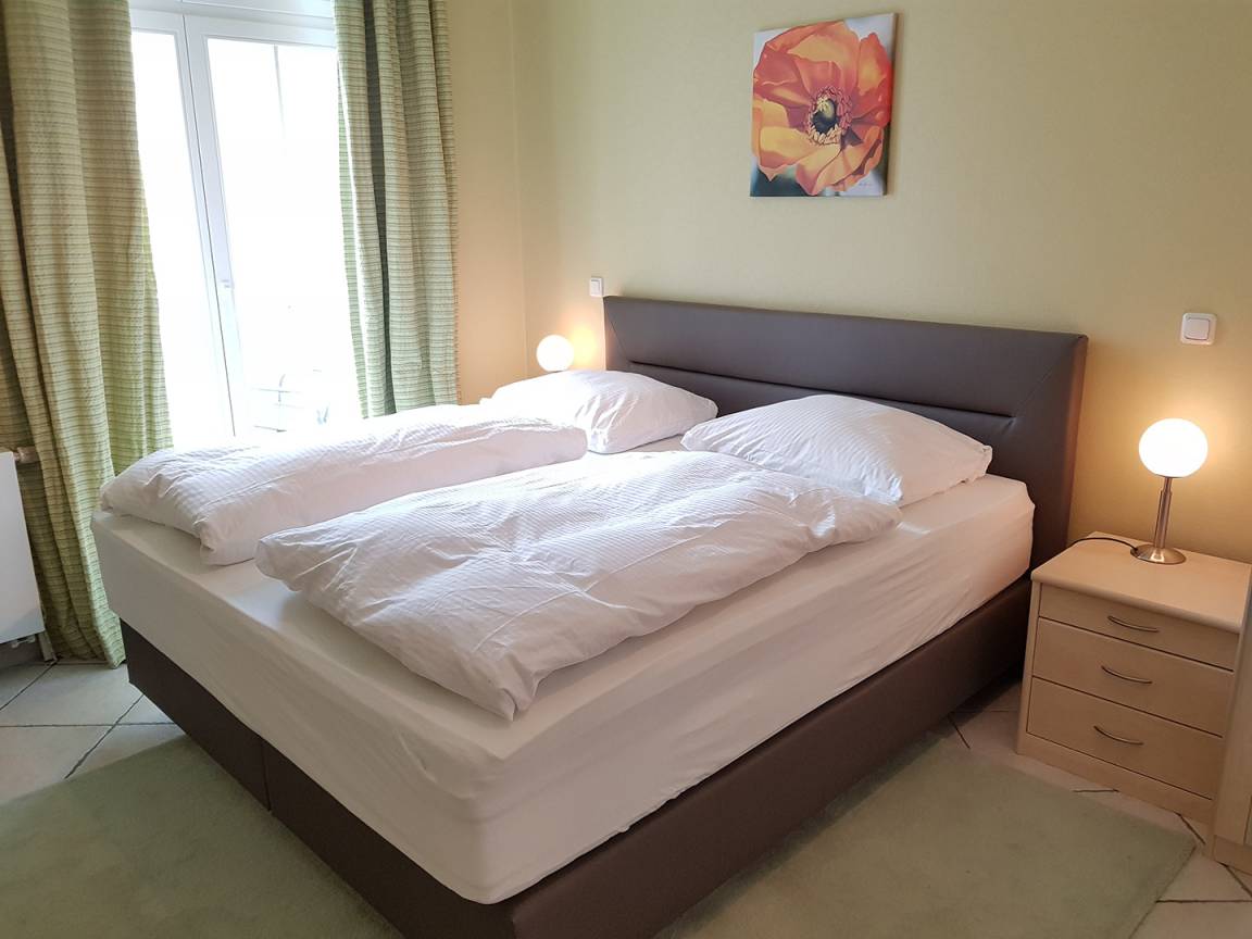 Für die nächtliche Entspannung verfügt dieses Appartement über 2 Schlafzimmer mit jeweils einem Boxspringbett mit den Abmaßen 160x200cm und 180x200cm und liegen ebenfalls zur Seeseite.