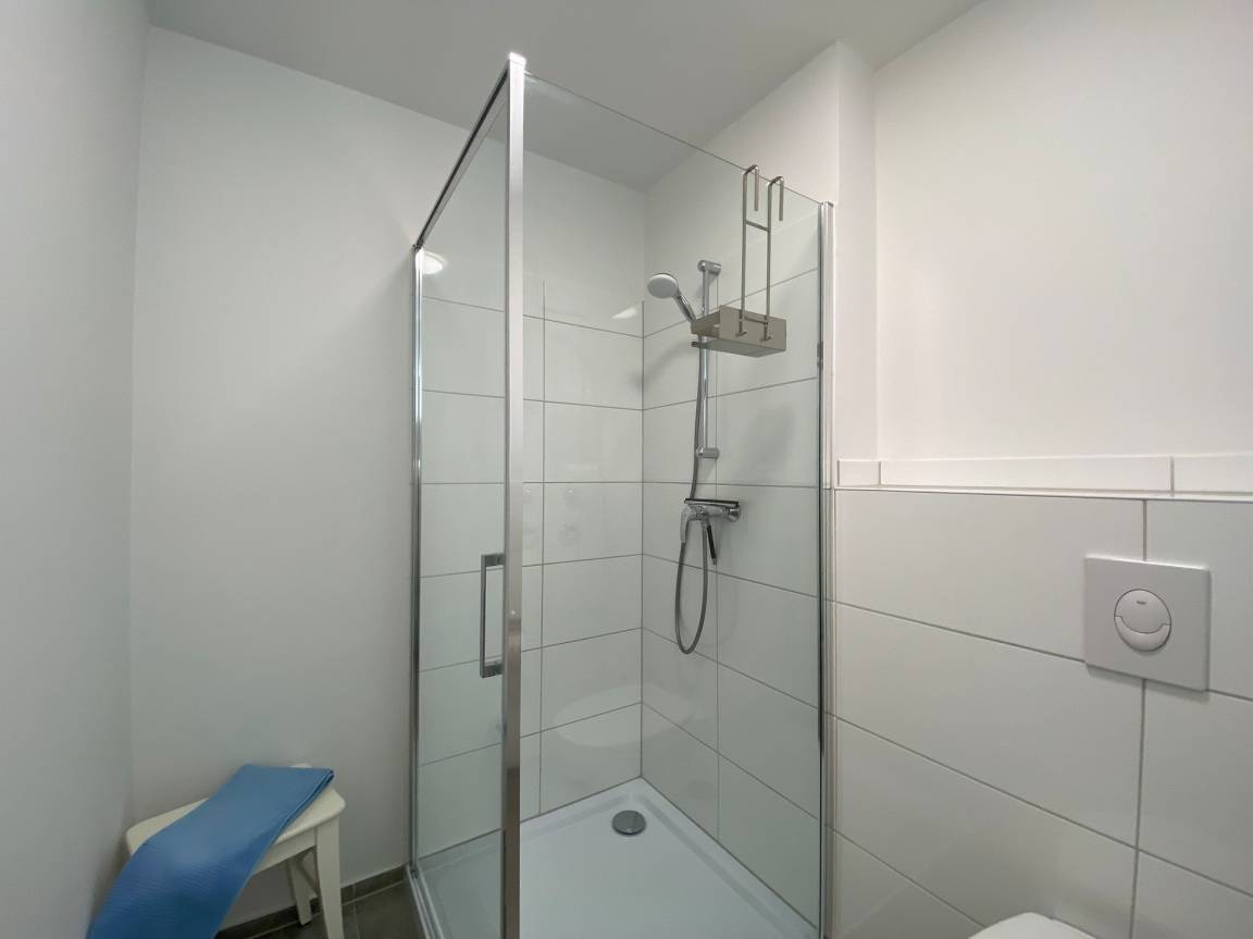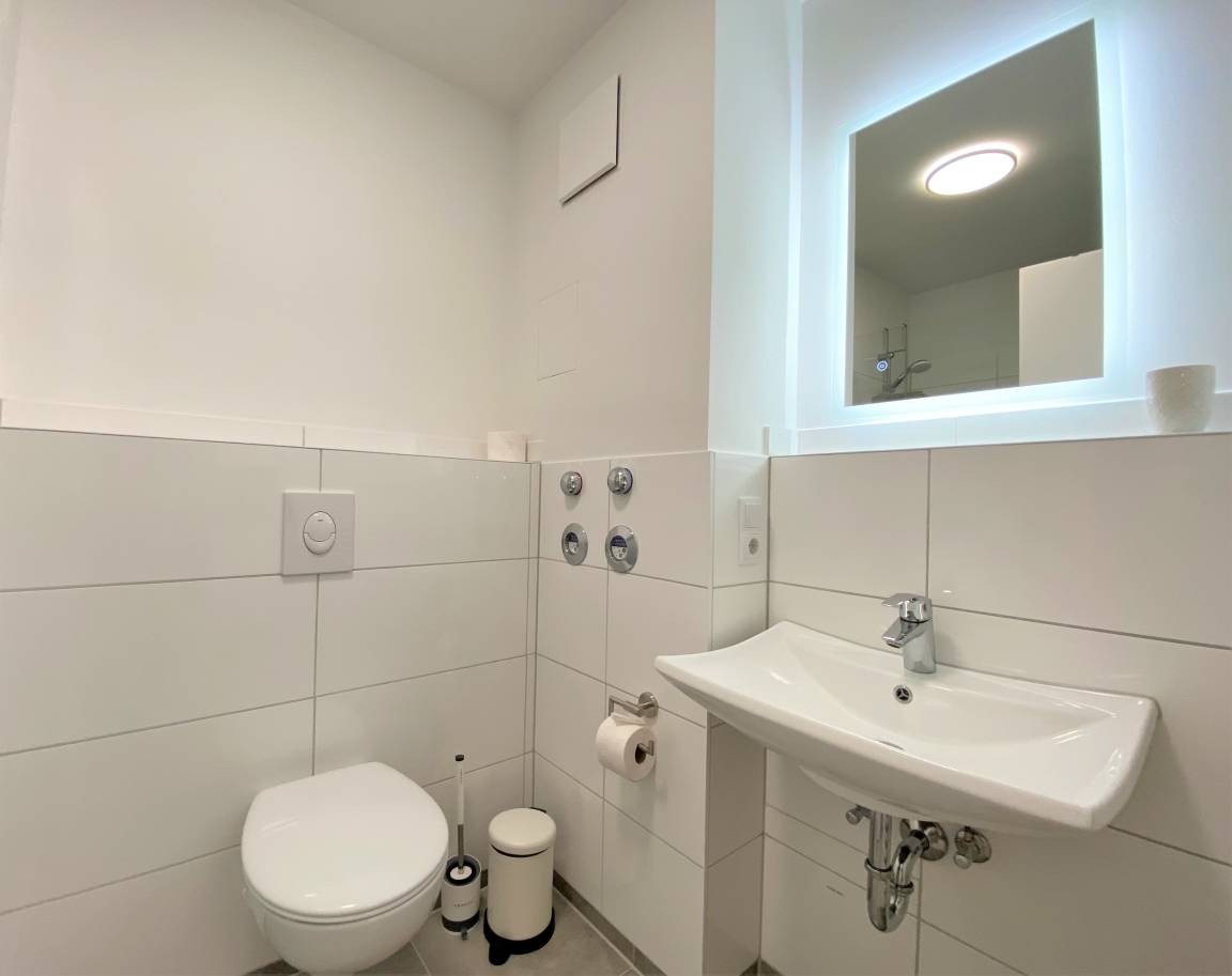 Das geschmackvoll geflieste Badezimmer verfügt über eine ebenerdige Dusche, WC sowie über einen großen beleuchteten Spiegel und genügend Ablagemöglichkeiten.