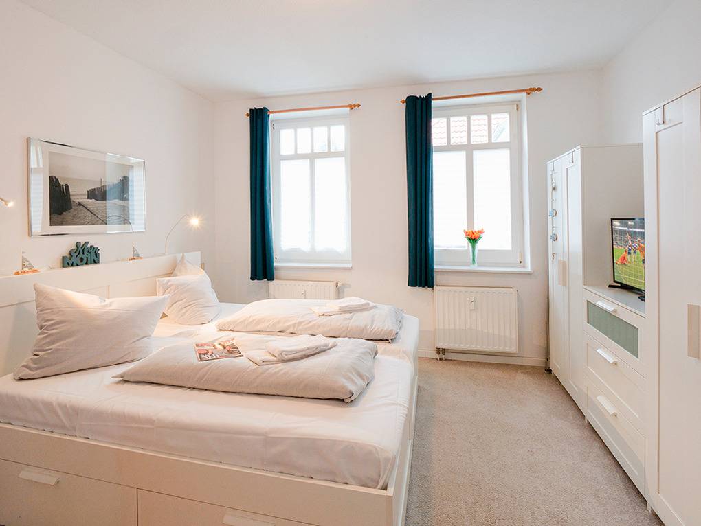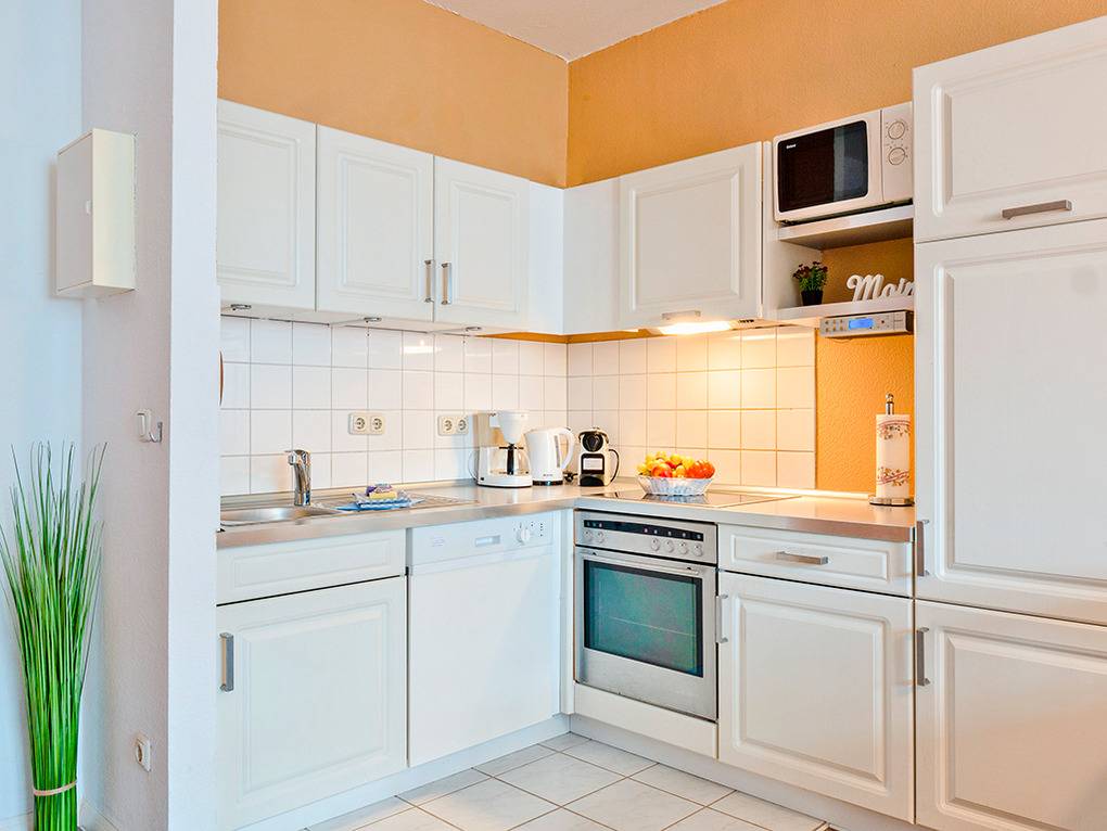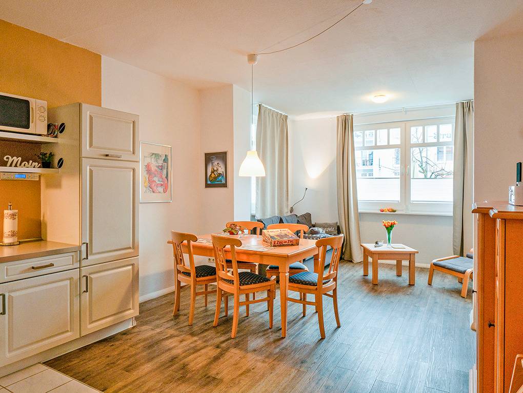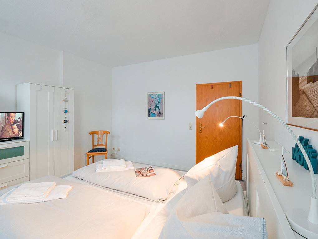 D 130.13 Wohnung 2-4 Pers.: 2-Zimmerwohnung mit ca. 50 qm Wohnfläche, 1. Etage. Wohn-/Essraum mit Sitzgarnitur (Ausziehcouch 2 Pers.), Flachbild-Sat-TV, Esstisch, gut ausgestattete Einbauküche (Backofen, Mikrowelle, Spülmaschine). Doppelzimmer mit Sat-TV. Bad/WC.