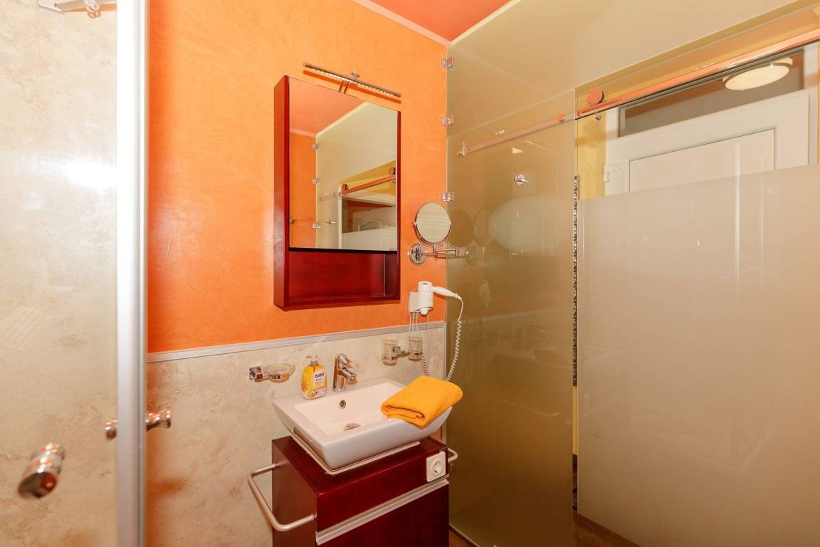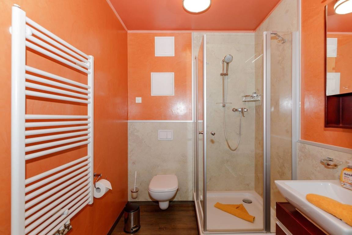 Das ansprechende Badezimmer im mediterranen Stil verfügt über ein WC , eine Glas-Duschkabine mit Regendusche und Handbrause sowie einen Handtuchheizkörper.