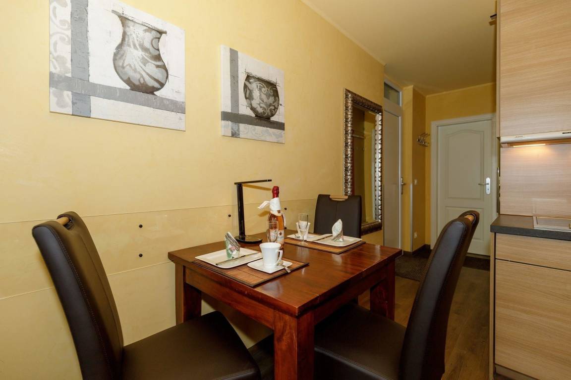 Die gemeinsamen Mahlzeiten können Sie am vorhandenen Esstisch mit 4 Stühlen einnehmen.