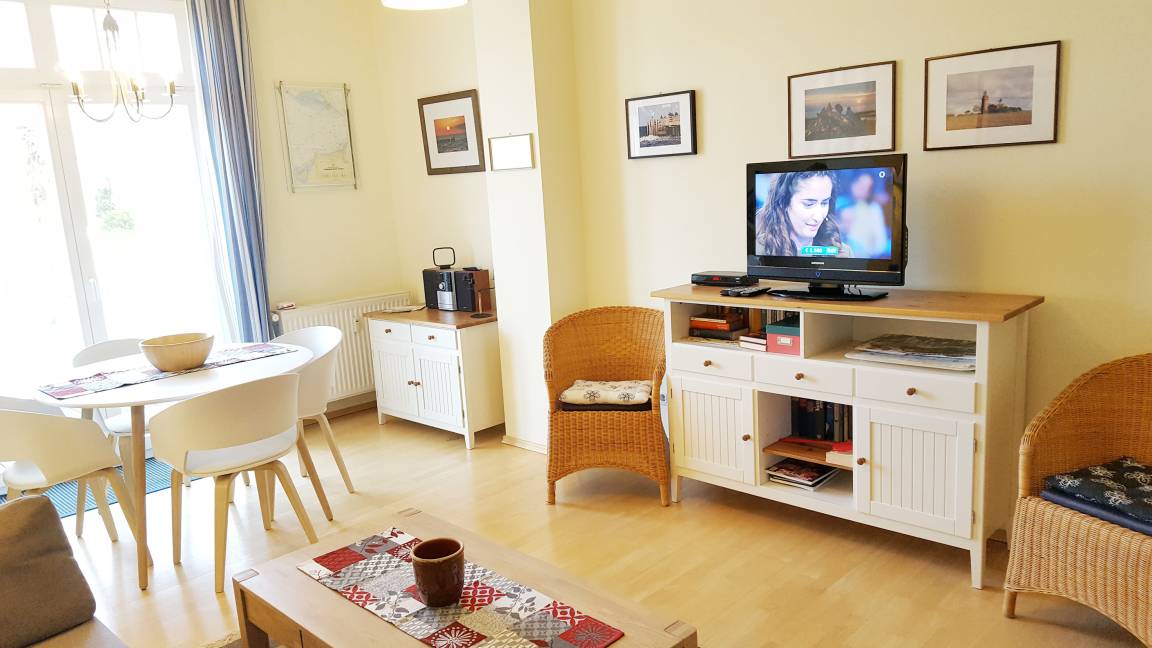 Der Wohnbereich ist eingerichtet mit einer Doppelschlafcouch mit Farb-TV, einer Pantryküche mit Geschirrspüler und einem Esstisch.