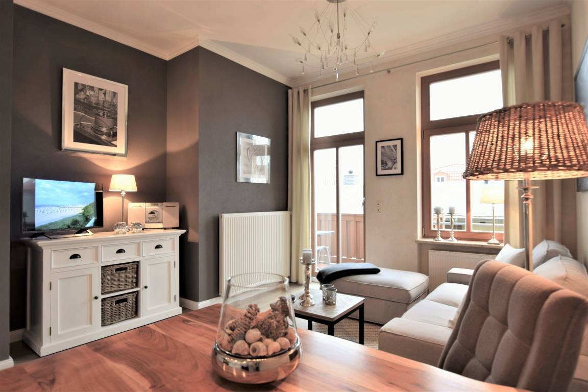 Die komfortabel und stilvoll eingerichtete Ferienwohnung ist mit hochwertigen Dekoartikeln liebevoll ausgestattet und befindet sich im 1. Obergeschoss des Neubaus mit separatem seitlichem Aufgang. Die komplette Wohnung mit dem Süd/Ost-Balkon ist von der Strandstrasse abgewandt und liegt somit zu der ruhigeren Gartenseite.