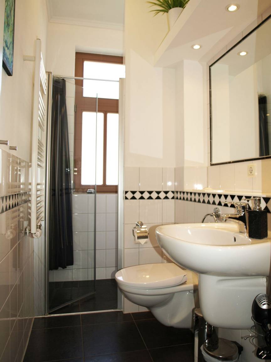 Das helle und hochwertig ausgestattete Bad verfügt über eine sehr großzügig eingemauerte Dusche, die ebenerdig begehbar ist, einen großen Spiegel mit Deckenspots sowie einen Handtuchheizkörper und Fußbodenheizung.