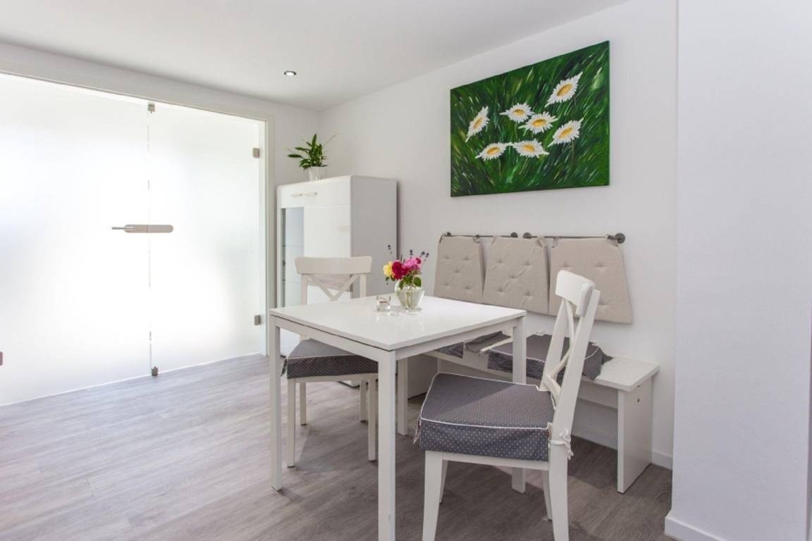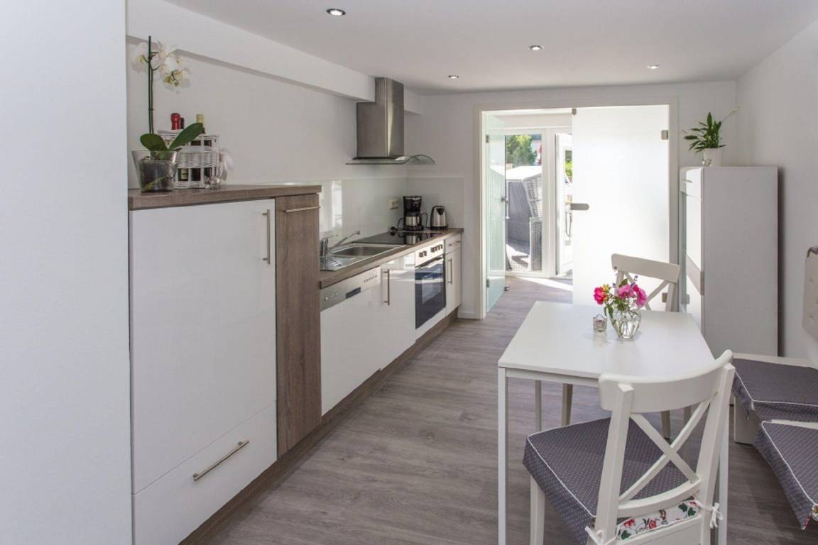 An den Wohnbereich und die Küche grenzt der Essbereich. Die Küchenzeile ist mit allen Geräten, wie 4-Platten-Ceran-Kochfeld, Kühlschrank mit Gefrierfach, Kaffeemaschine, Wasserkocher und ausreichend Kochutensilien ausgestattet.