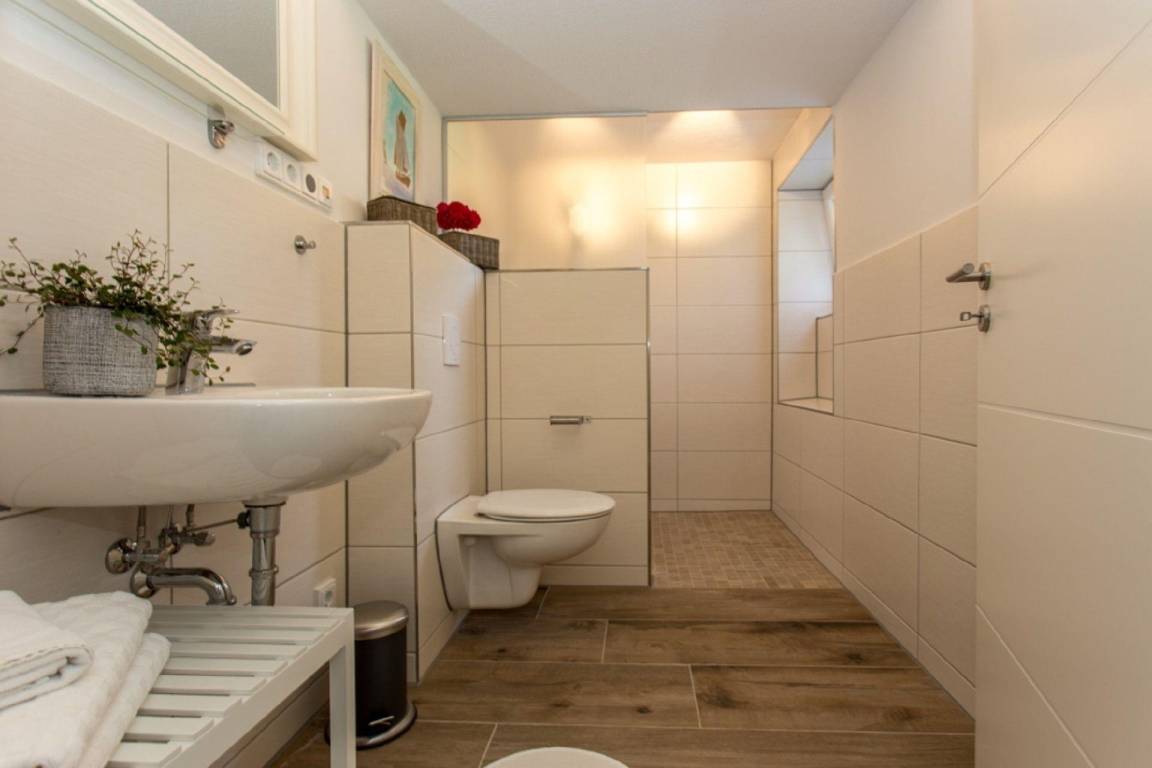 Das Bad im modernen Design ist mit ebenerdiger Dusche und Handtuchtrockner ausgestattet.