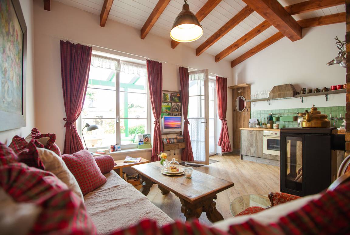 Schlafen Sie wie ein Igel im großen Kuschelbett (180x200) und entspannen Sie am knisterndem Holzofen im behaglichen Wohnbereich mit großem Ecksofa. Die Gartenküche lädt zum brutzeln und genießen ein.