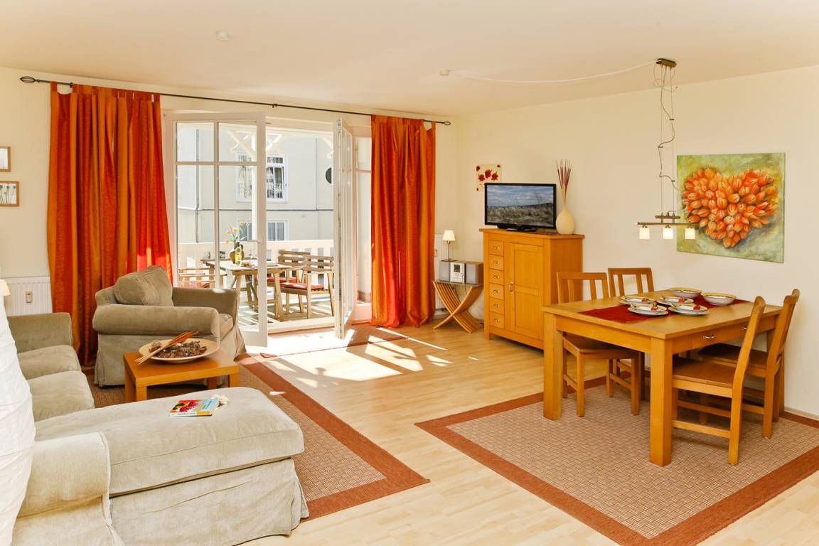 Die großzügige 3-Zimmer-Fewo befindet sich in Hochparterre. Die Wohnung ist ca. 60 m² groß und für bis zu 4 Personen eingerichtet. Im großen Schlafzimmer finden Sie ein Doppelbett (1,60 m breit, durchgehende Matratze). Das 2. Schlafzimmer ist mit einem Etagenbett ausgestattet. Der Wohnbereich verfügt über eine Sitzgruppe und Esstisch sowie eine Couch.