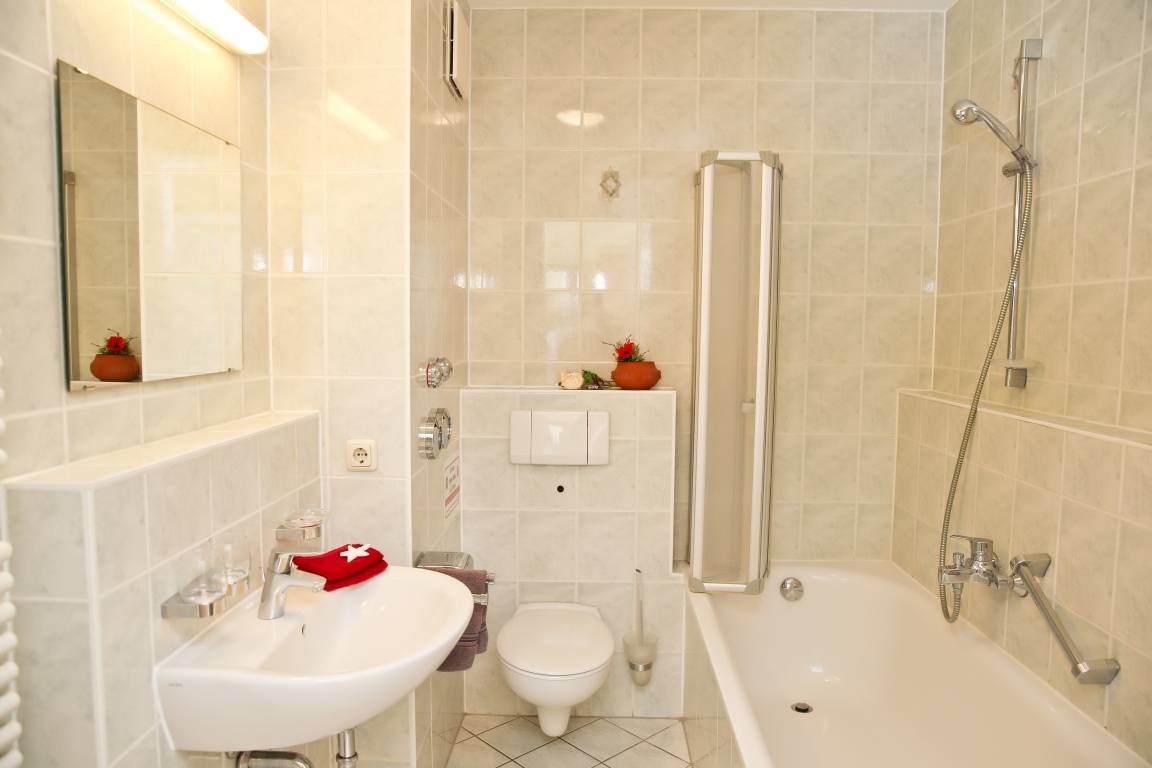 Im Badezimmer sorgt eine Badewanne für entspannte Wohlfühlmomente.