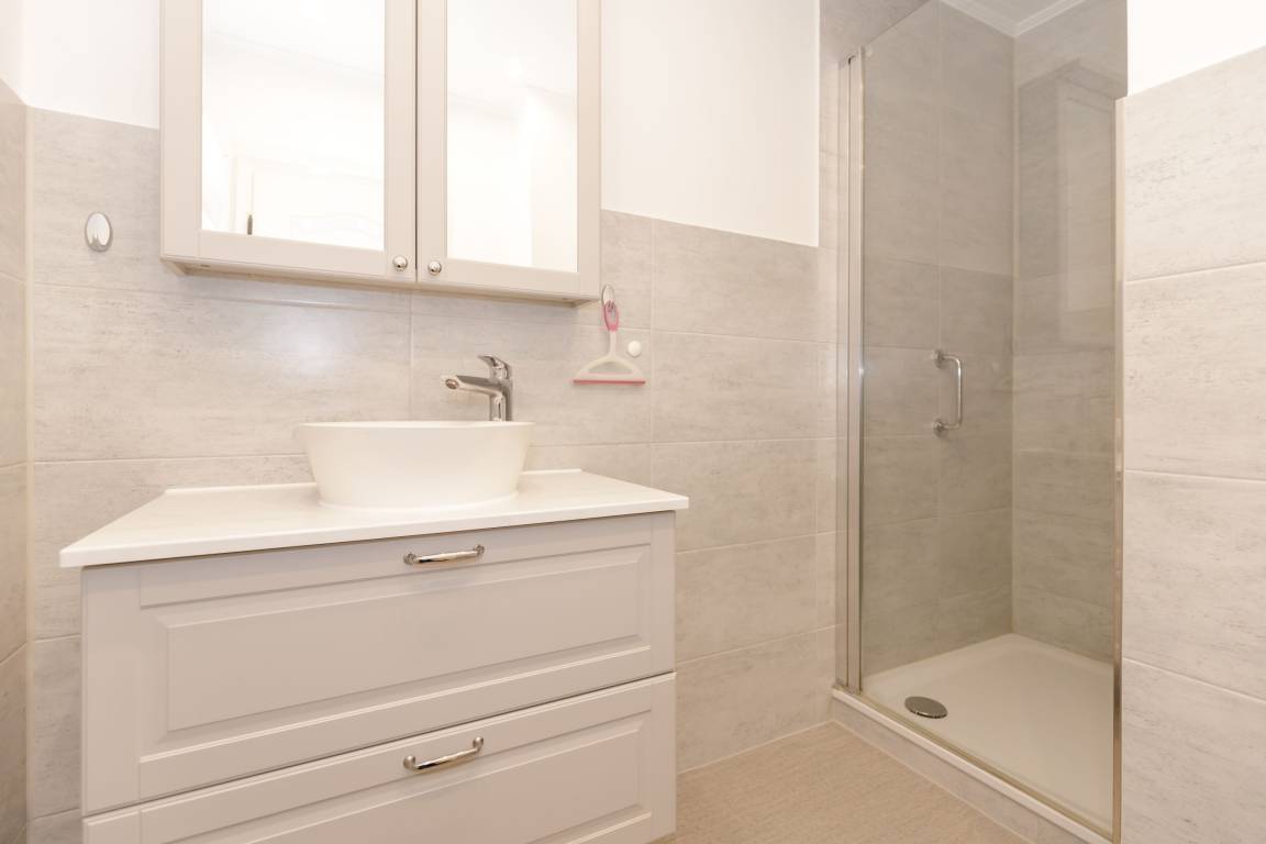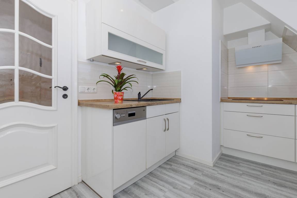 Die separate Küche ist gut ausgestattet mit einem Kühlschrank mit Gefrierfach, einer Spüle, einem Geschirrspüler, einem Cerankochfeld, einem Toaster und einer Kaffeemaschine.