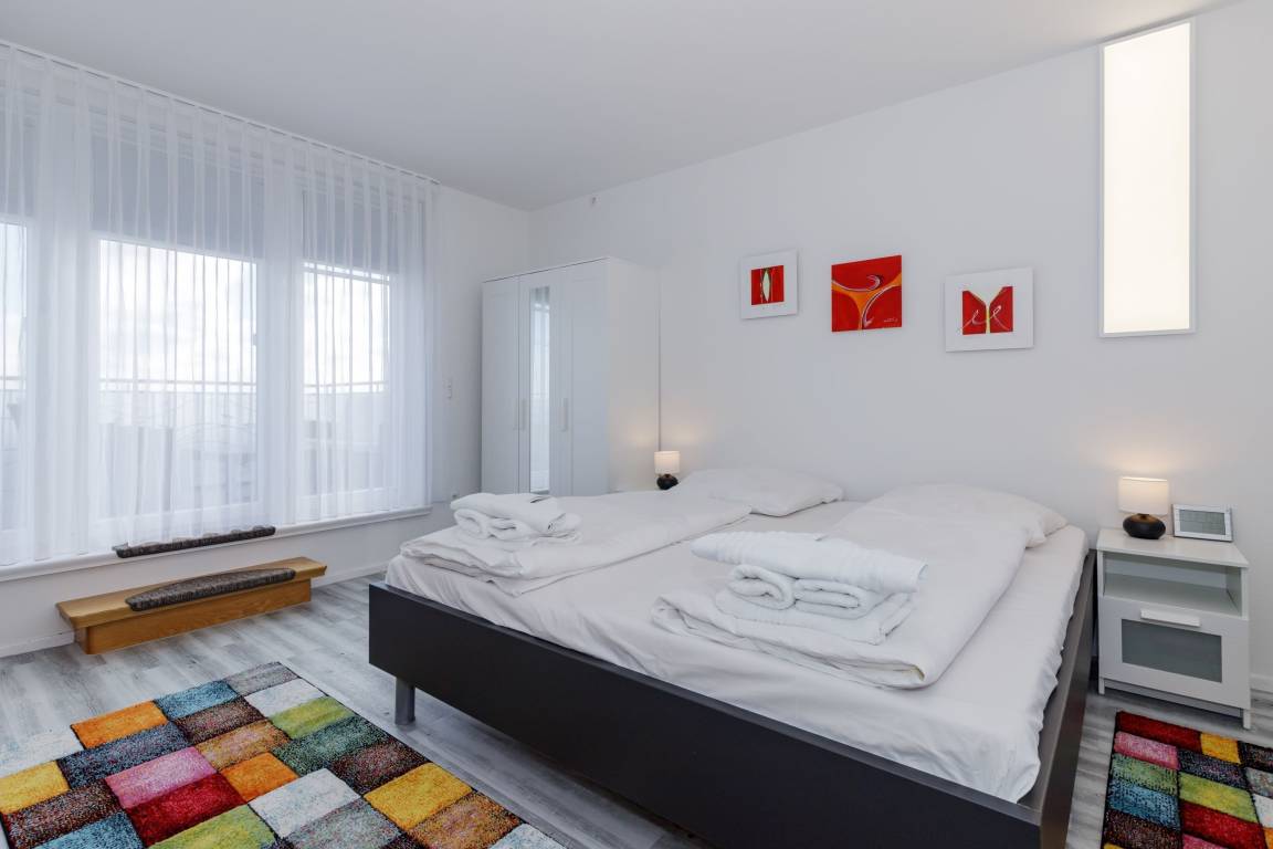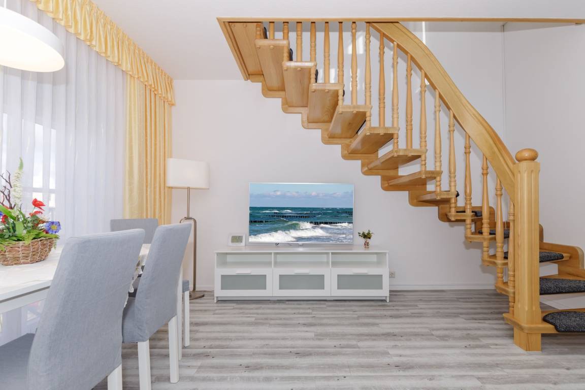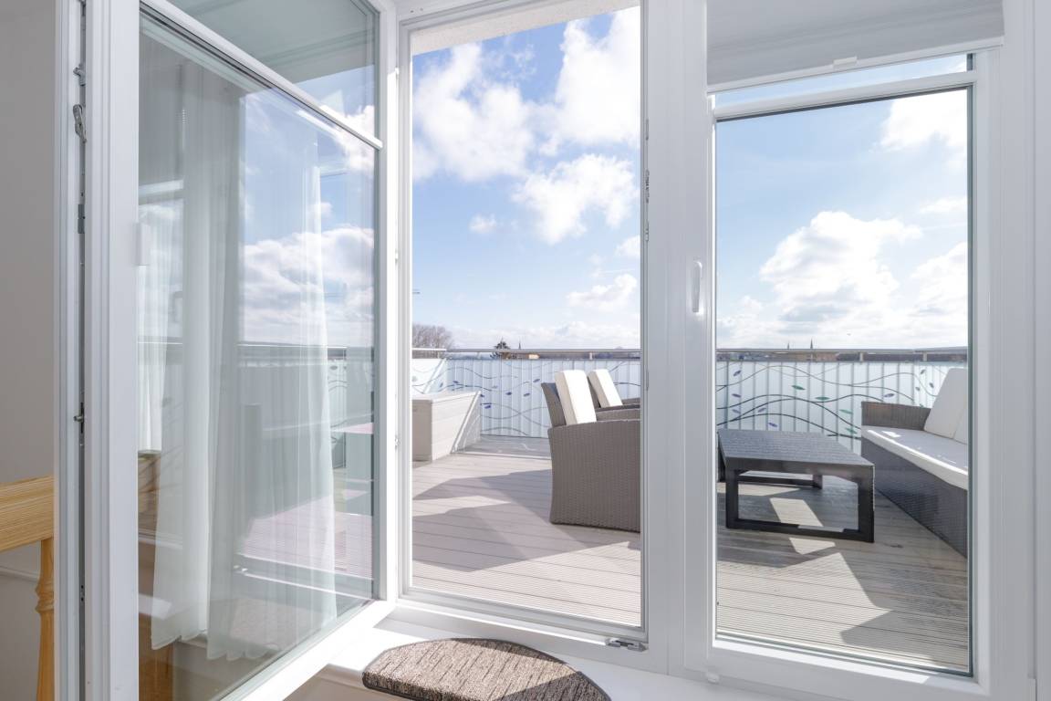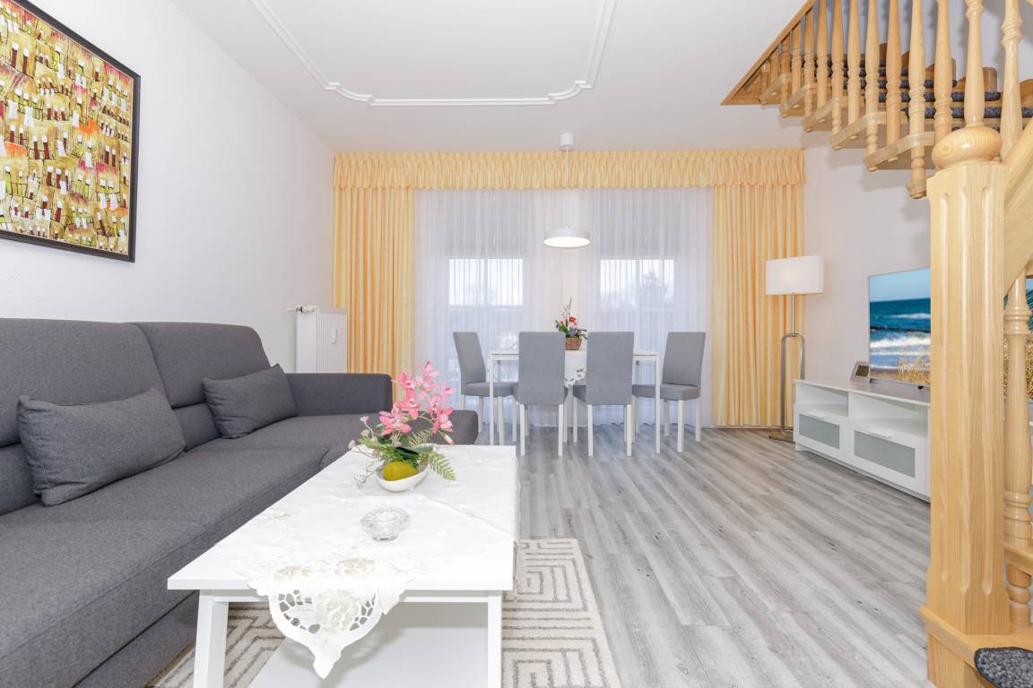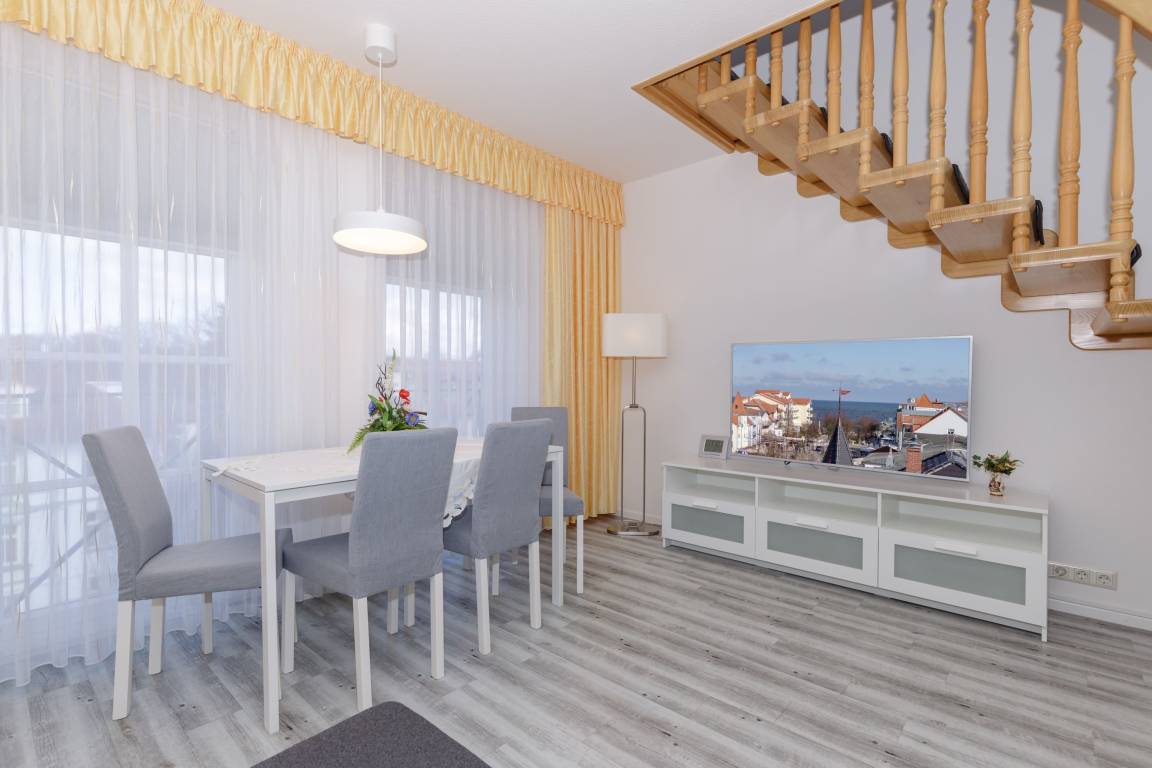Mit dem Fahrstuhl gelangen Sie in das Appartement im 4. Obergeschoss. Über eine Treppe erreichen Sie den Schlafbereich auf der Galerie. Es verfügt über ein geräumiges Wohnzimmer mit Essbereich einem Flachbild-TV, ein Schlafzimmer mit Doppelbett sowie ein Badezimmer mit Dusche. Über die Galerie erreichen Sie die Dachterrasse, die einen exklusiven Blick auf Kühlungsborn bietet.