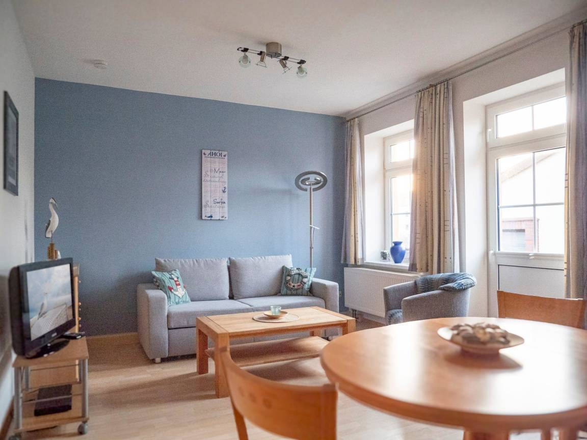 Im geschmackvoll möblierten Wohnzimmer mit einer komfortablen Doppel-Schlafcouch und einem bequemen Sessel verbringen Sie gemütliche Stunden mit der Familie; ein Flachbild-TV mit Blueray-Player sowie abwechslungsreiche Bücher und Spiele für Kinder und Erwachsene sorgen für Ihre Unterhaltung.