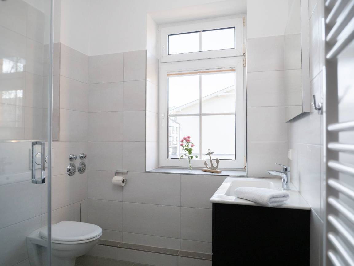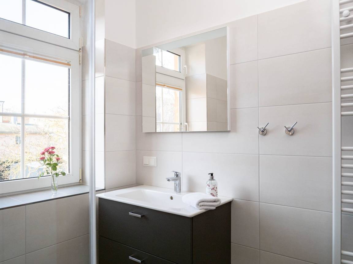 Das hochwertige Badezimmer mit Fenster verfügt über eine Dusche, ein WC, ein Waschbecken mit Unterschrank sowie einen Handtuchheizkörper. Ihre Badutensilien finden genügend Platz auf den vorhandenen Abstellflächen.