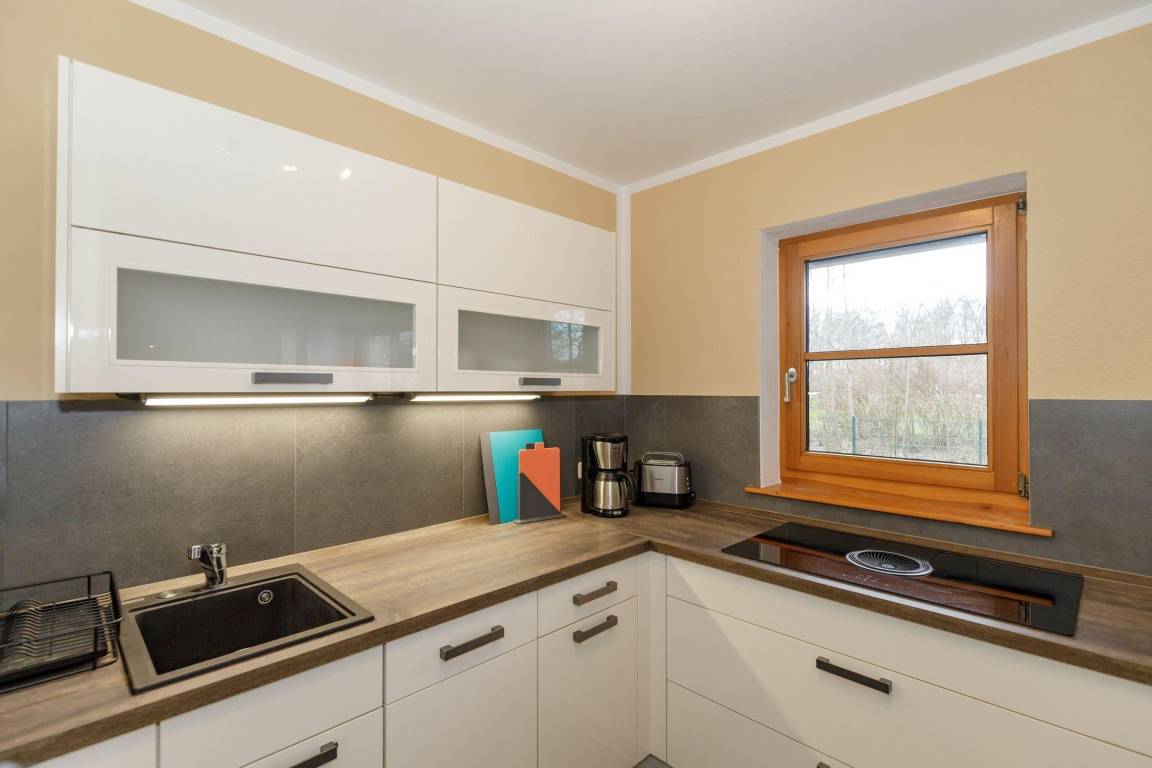 An den Wohnbereich grenzt die offene und sehr moderne Küche. Diese ist mit allen Annehmlichkeiten ausgestattet wie Geschirrspüler, 4 Platten-Touch-Kochfeld, Gefrierschrank, Mikrowelle, Wasserkocher, Kaffeemaschine Toaster und vieles mehr.