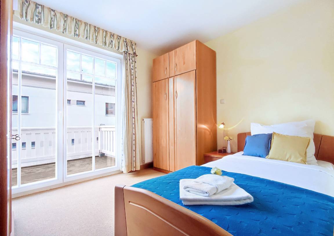 Vom zweiten Schlafzimmer aus gelangen Sie auf den 2. Balkon, dieses ist mit einem Einzelbett sowie einem Einzelschrankbett möbliert. Das Hauptschlafzimmer verfügt über ein Doppelbett.