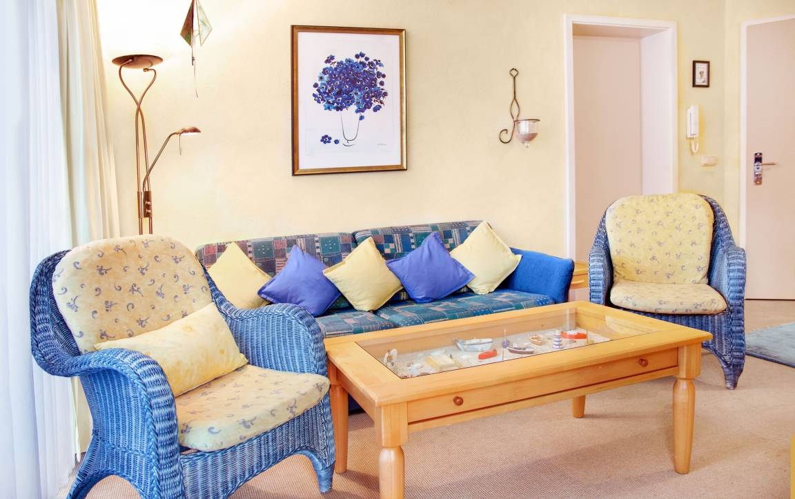 Der Wohnbereich ist mit einer Sitzgruppe ausgestattet und verfügt über den Zugang zu einem der beiden Balkone, welcher der größere der Beiden ist und zur Süd-Seite liegt.