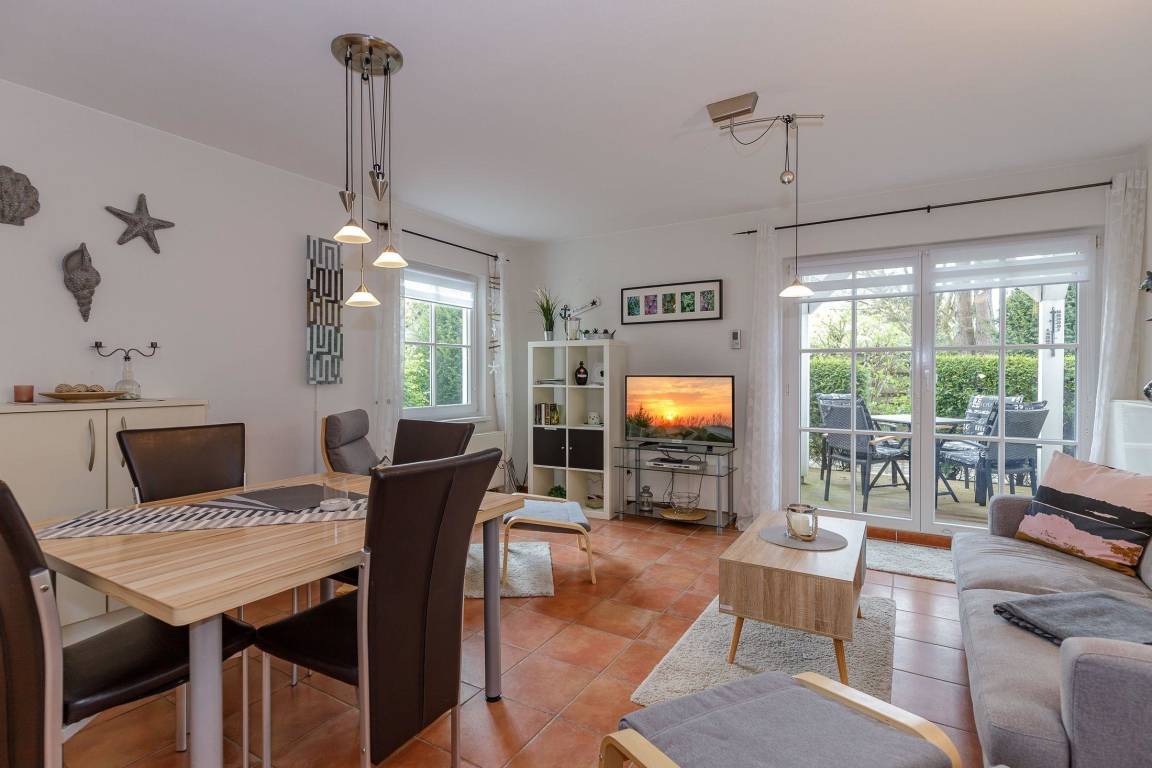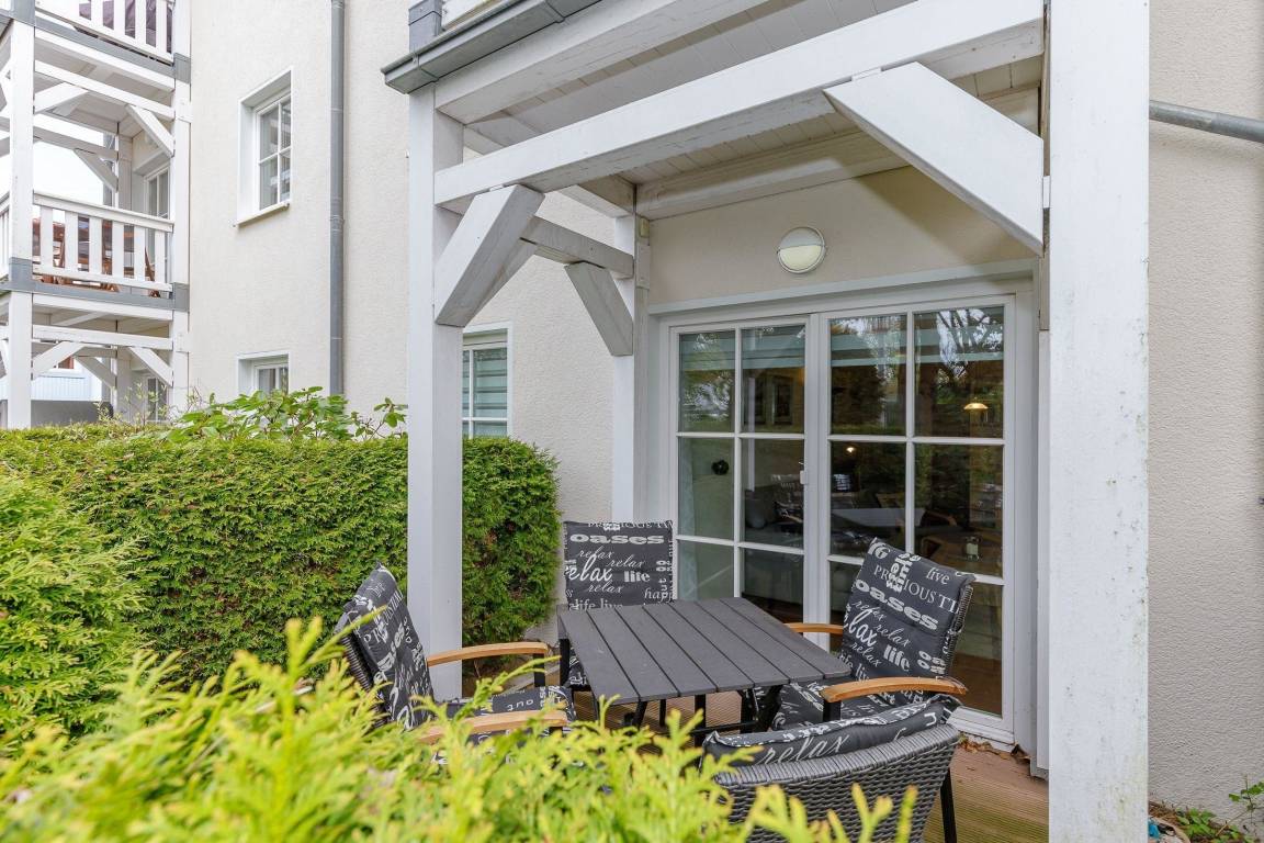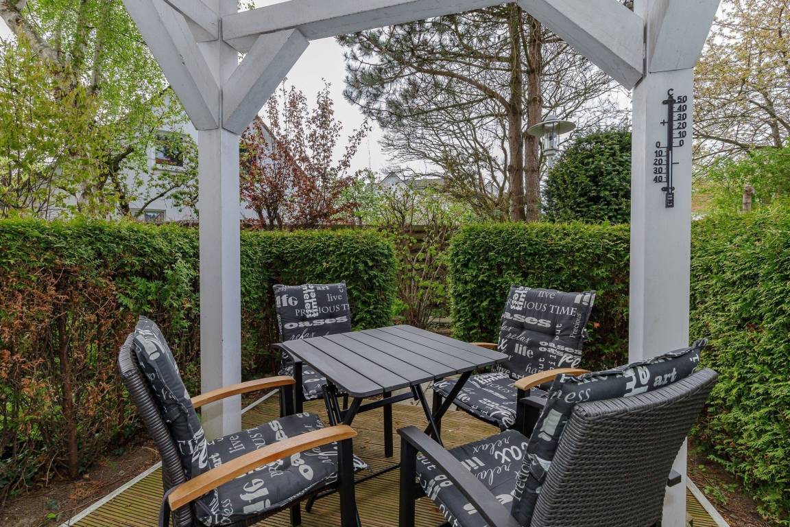 Auf der überdachten Süd-West-Terrasse, die Sie vom Wohnzimmer aus erreichen, können Sie auf bequemen Gartenmöbeln entspannen und die Sonne genießen.