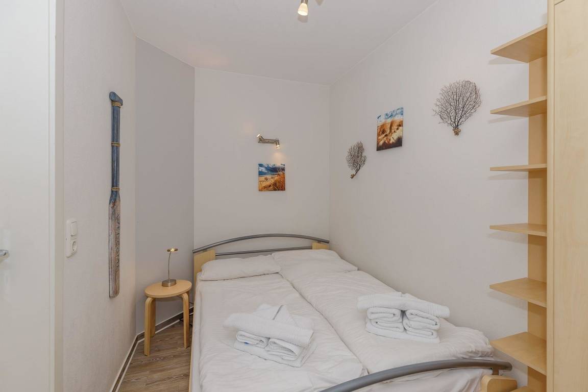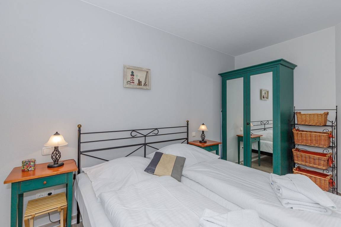 Das zweite Schlafzimmer wurde gerade ein wenig umgestaltet. Nun finden Sie hier ein 1,20 m breites Bett, auf dem zwei Kinder oder auch zwei junge Erwachsene bequem Platz finden für einen erholsamen Schlaf. Auch in diesem Zimmer befindet sich ein Kleiderschrank für Ihre Urlaubsgarderobe.