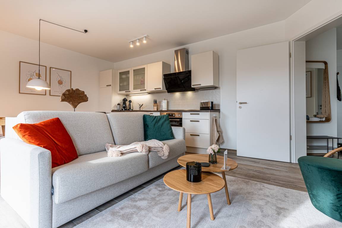Das elegante Wohnzimmer ist mit einer bequemen Couch und einem großen Flatscreen-TV ausgestattet. Ankommen und direkt Wohlfühlen, unser Appartement lässt während Ihres Aufenthaltes keine Wünsche offen.