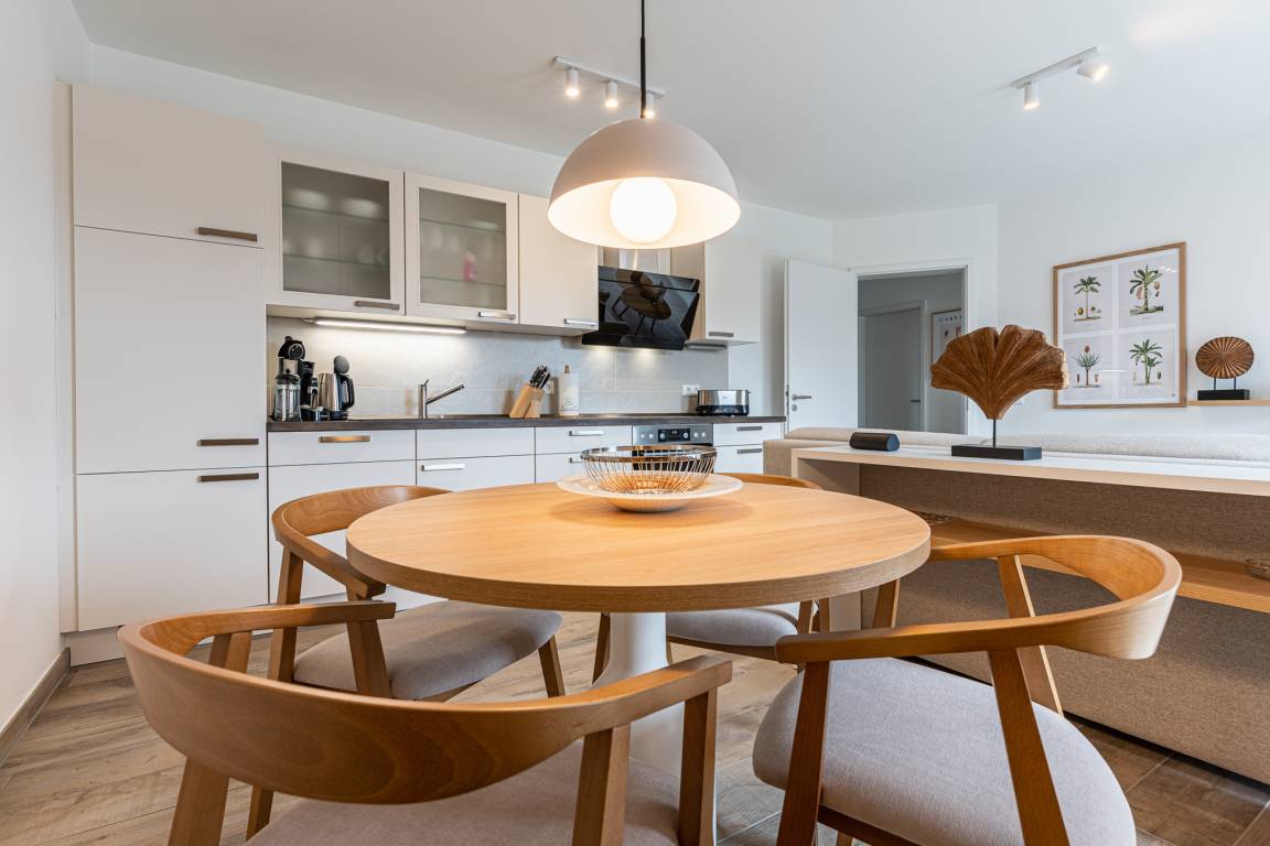 An Wohnbereich grenzt die offene, voll ausgestattete Küche, welche mit Kühlschrank inkl. Gefrierfach, 4-Platten-Ceran-Kochfeld, Backofen, Geschirrspüler, Wasserkocher, Toaster und Senseo-Kaffeemaschine keine Wünsche offen lässt.